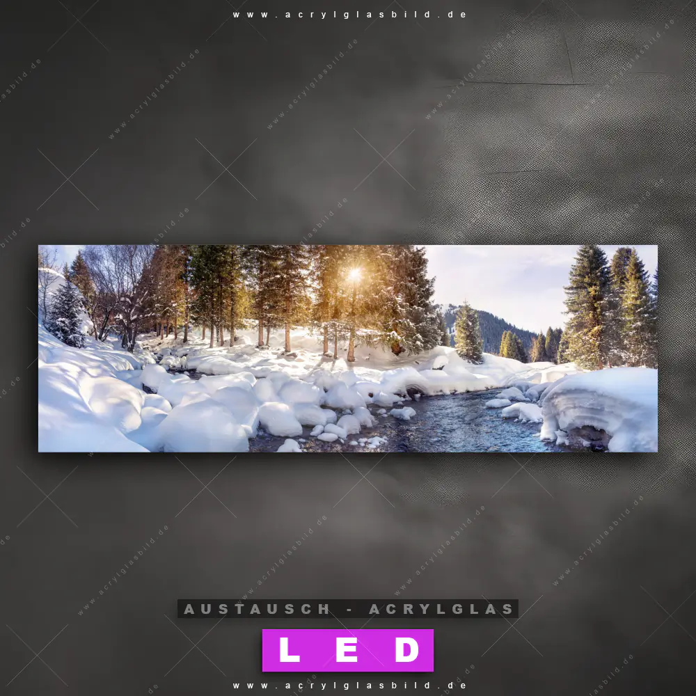 Wechsel-Acrylglas Canvalight® DIA | Schneebedeckte Landschaft am Fluss | Panorama