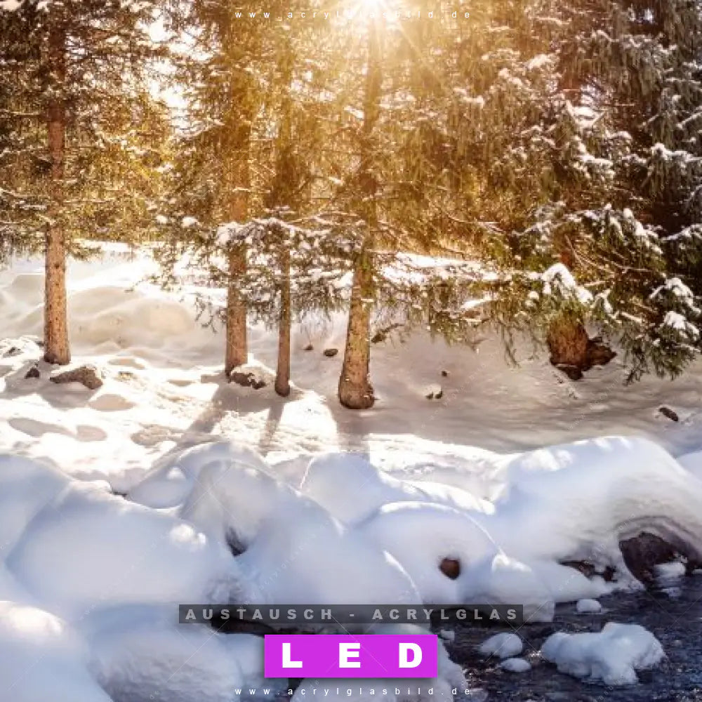 Begriffe wie Berge, Gebirge, Schneelandschaft, Winter, Schnee, Weihnachten, Nadelwald, Tannenbäume, Sonnenlicht, Sonne, Sonnenaufgang, Sonnenuntergang, Fluss, Bach haben dich auf der Suche nach deinem neuen Austausch-Acrylglasbild inspiriert? Dann sollte das Wechsel-Acrylglasbild Sonnenstrahlen im Winterwald für dein bereits vorhandenes LED Acrylglasbild Canvalight® DIA den Weg zu dir finden.
