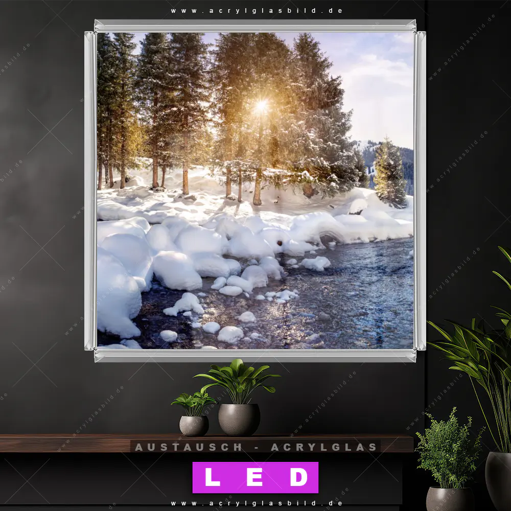 Begriffe wie Berge, Gebirge, Schneelandschaft, Winter, Schnee, Weihnachten, Nadelwald, Tannenbäume, Sonnenlicht, Sonne, Sonnenaufgang, Sonnenuntergang, Fluss, Bach haben dich auf der Suche nach deinem neuen Austausch-Acrylglasbild inspiriert? Dann sollte das Wechsel-Acrylglasbild Sonnenstrahlen im Winterwald für dein bereits vorhandenes LED Acrylglasbild Canvalight® DIA den Weg zu dir finden.
