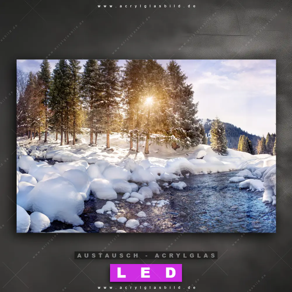 Begriffe wie Berge, Gebirge, Schneelandschaft, Winter, Schnee, Weihnachten, Nadelwald, Tannenbäume, Sonnenlicht, Sonne, Sonnenaufgang, Sonnenuntergang, Fluss, Bach haben dich auf der Suche nach deinem neuen Austausch-Acrylglasbild inspiriert? Dann sollte das Wechsel-Acrylglasbild Sonnenstrahlen im Winterwald für dein bereits vorhandenes LED Acrylglasbild Canvalight® DIA den Weg zu dir finden.