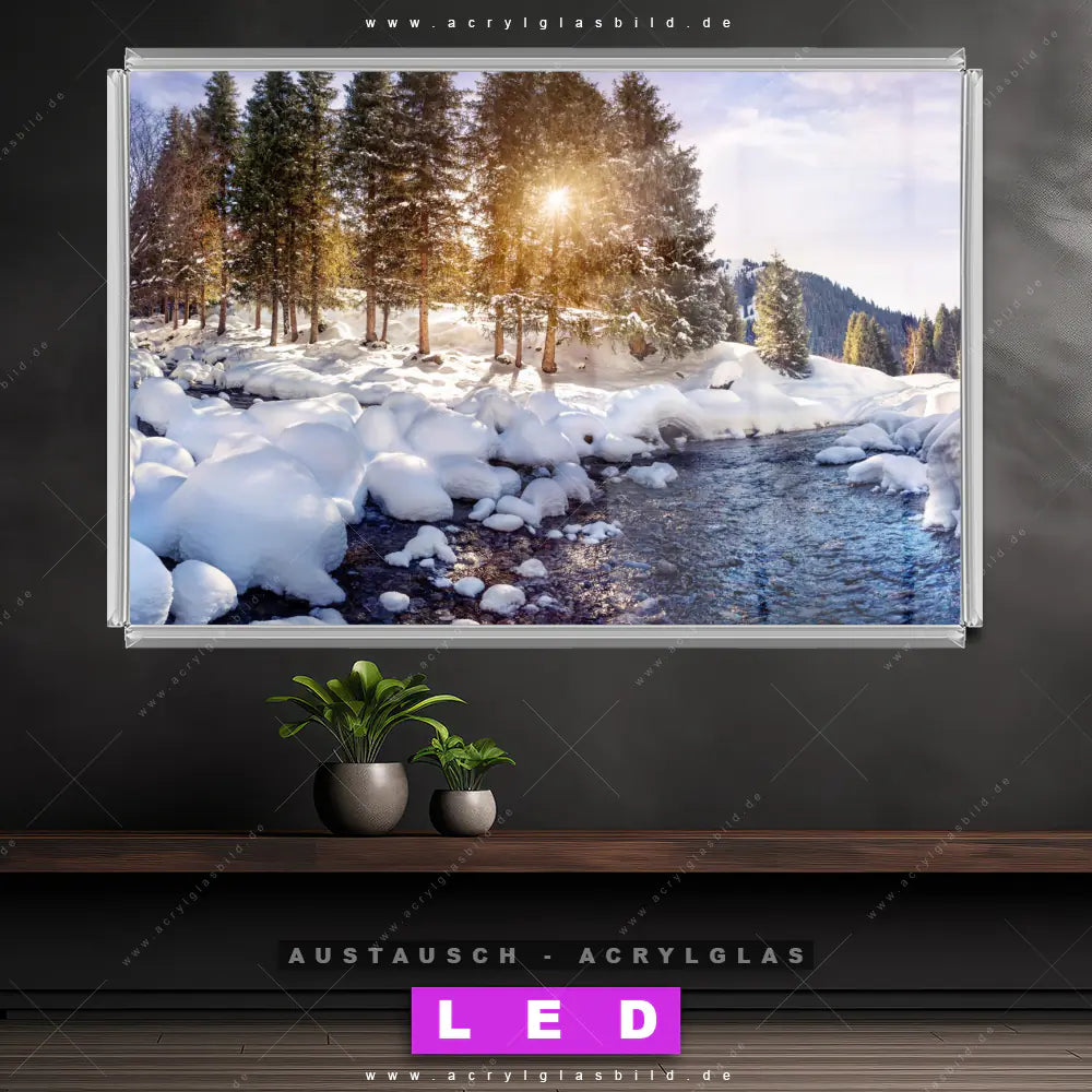 Wechsel-Acrylglas Canvalight® DIA | Schneebedeckte Landschaft am Fluss | Querformat