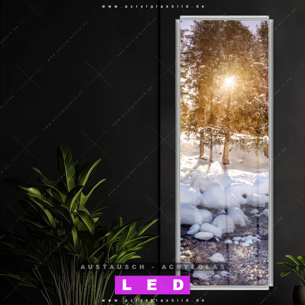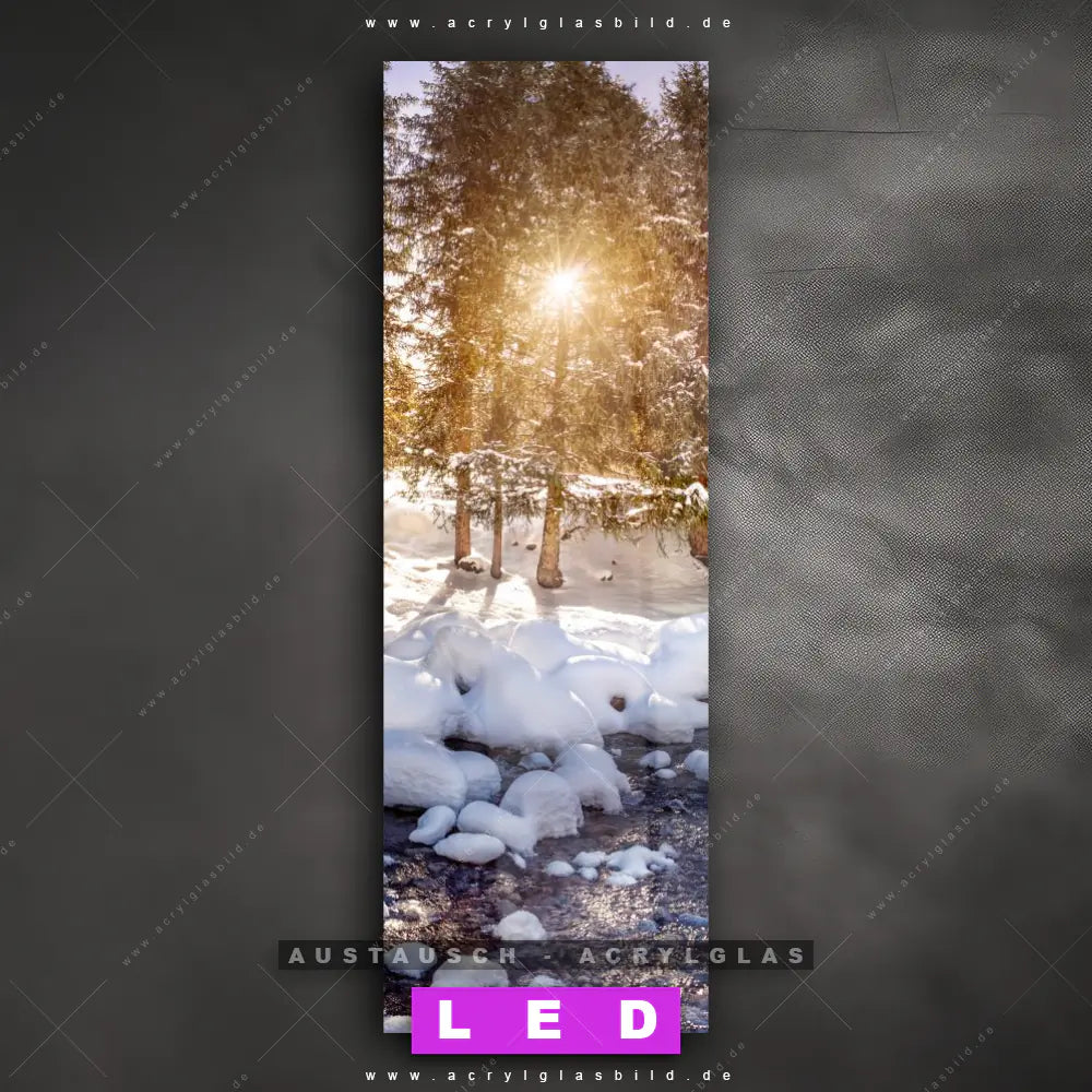 Begriffe wie Berge, Gebirge, Schneelandschaft, Winter, Schnee, Weihnachten, Nadelwald, Tannenbäume, Sonnenlicht, Sonne, Sonnenaufgang, Sonnenuntergang, Fluss, Bach haben dich auf der Suche nach deinem neuen Austausch-Acrylglasbild inspiriert? Dann sollte das Wechsel-Acrylglasbild Sonnenstrahlen im Winterwald für dein bereits vorhandenes LED Acrylglasbild Canvalight® DIA den Weg zu dir finden.