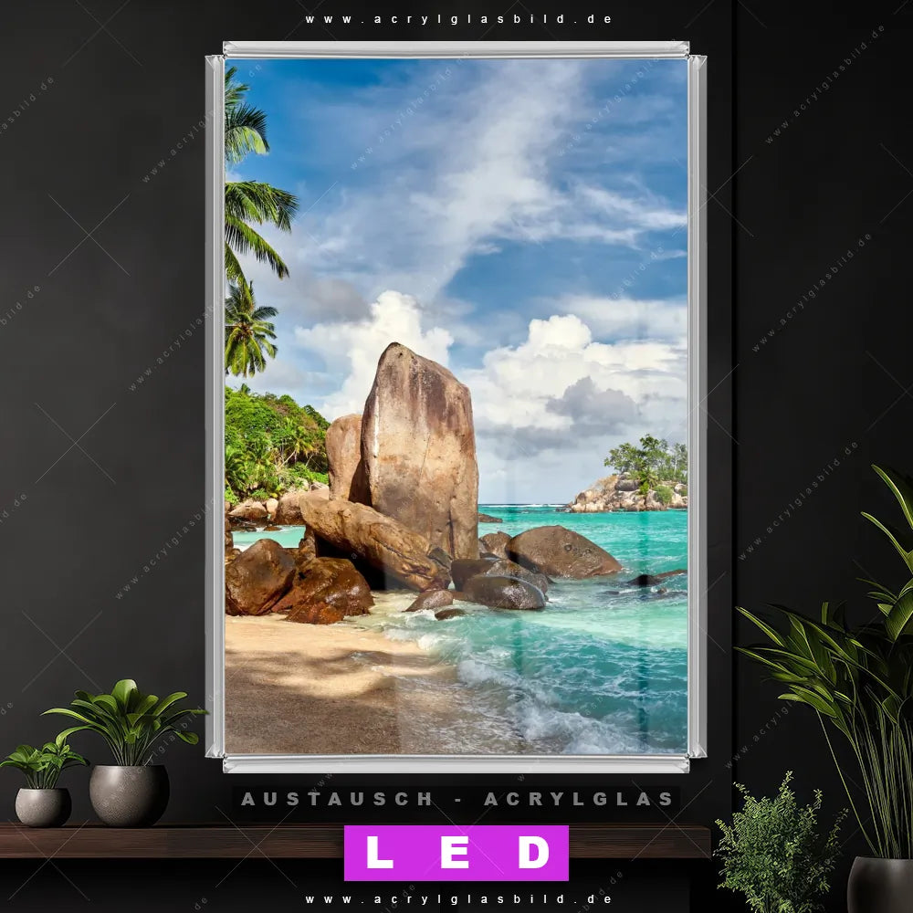 Begriffe wie Sand, Ozean, Wasser, Küste, Palmen, Sommer, Urlaub, Reisen, Südsee, Karibik, Insel, Meer, Steine, Felsen, Natur haben dich auf der Suche nach deinem neuen Austausch-Acrylglasbild inspiriert? Dann sollte das Wechsel-Acrylglasbild Felsen auf den Seychellen für dein bereits vorhandenes LED Acrylglasbild Canvalight® DIA den Weg zu dir finden.