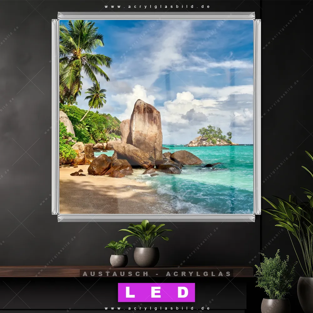 Begriffe wie Sand, Ozean, Wasser, Küste, Palmen, Sommer, Urlaub, Reisen, Südsee, Karibik, Insel, Meer, Steine, Felsen, Natur haben dich auf der Suche nach deinem neuen Austausch-Acrylglasbild inspiriert? Dann sollte das Wechsel-Acrylglasbild Felsen auf den Seychellen für dein bereits vorhandenes LED Acrylglasbild Canvalight® DIA den Weg zu dir finden.