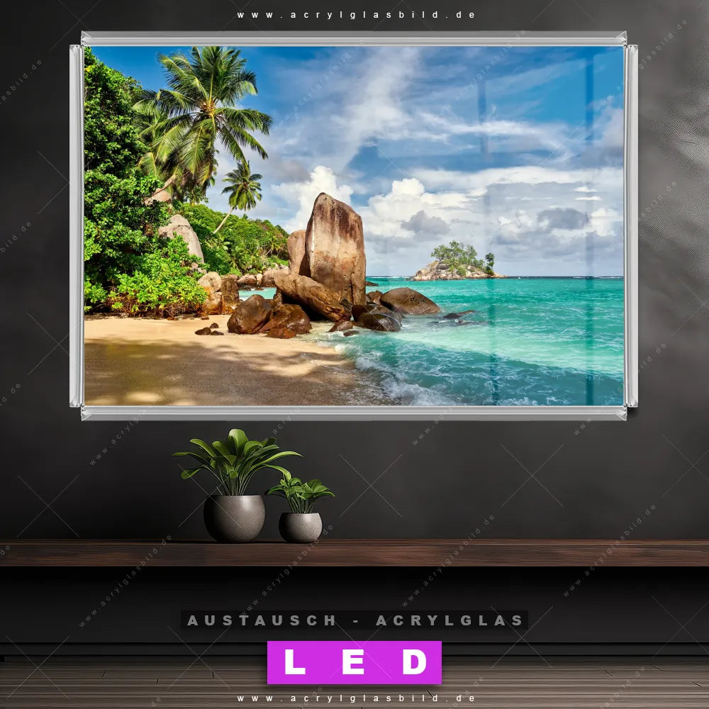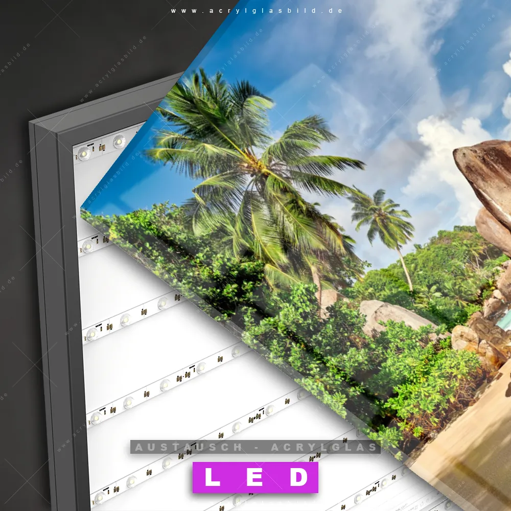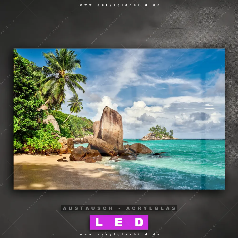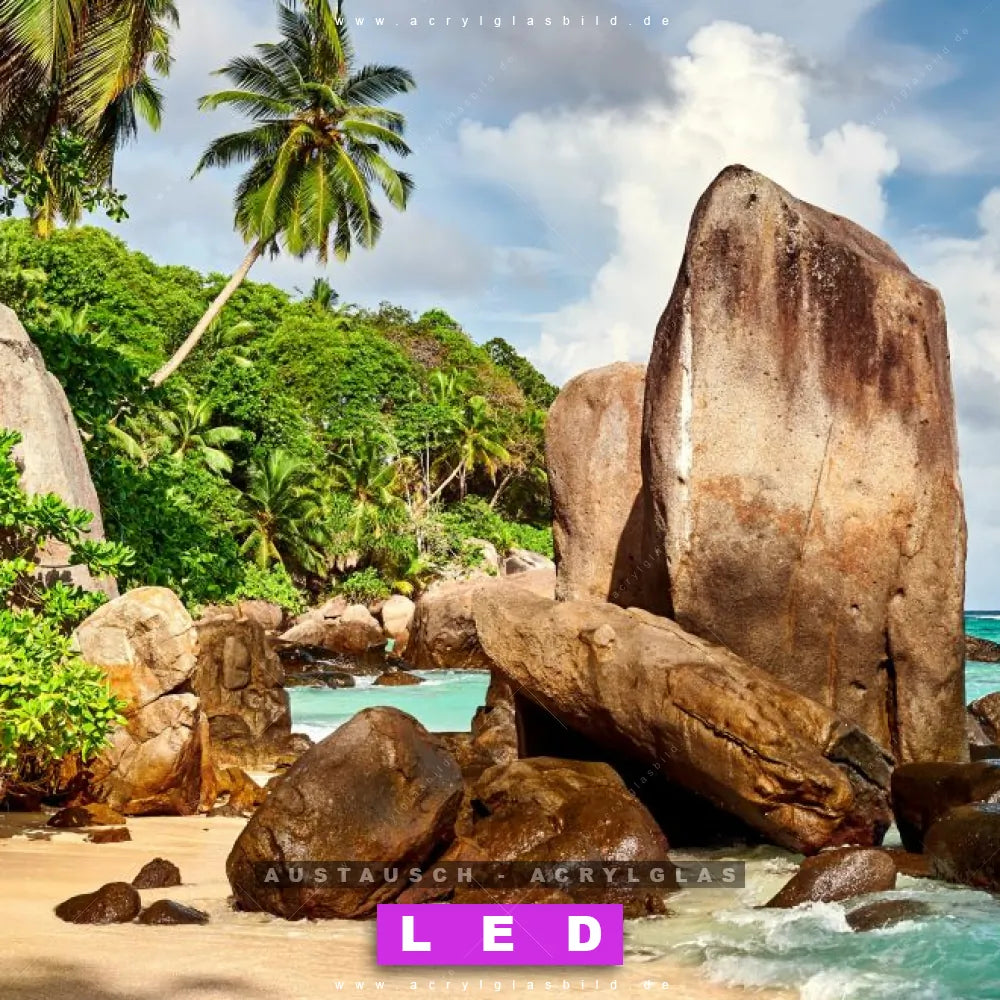 Begriffe wie Sand, Ozean, Wasser, Küste, Palmen, Sommer, Urlaub, Reisen, Südsee, Karibik, Insel, Meer, Steine, Felsen, Natur haben dich auf der Suche nach deinem neuen Austausch-Acrylglasbild inspiriert? Dann sollte das Wechsel-Acrylglasbild Felsen auf den Seychellen für dein bereits vorhandenes LED Acrylglasbild Canvalight® DIA den Weg zu dir finden.