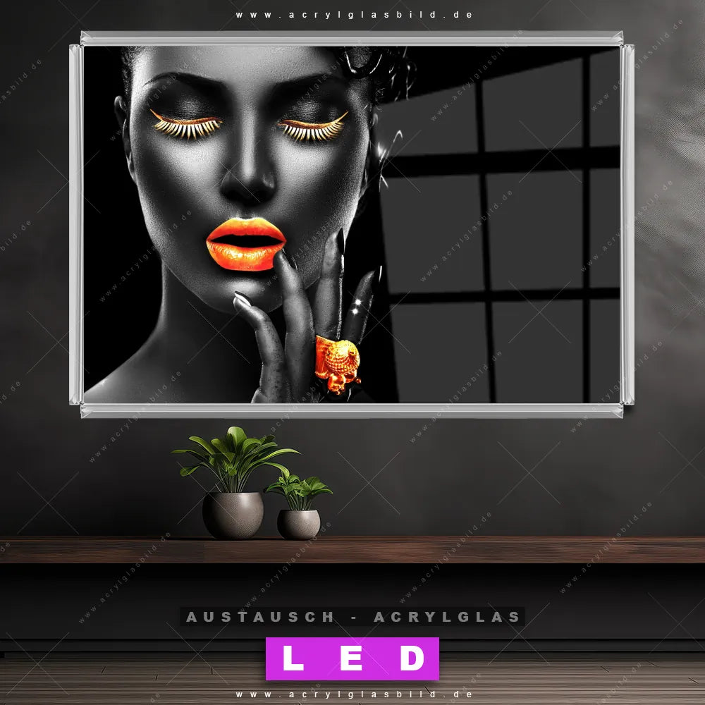 Begriffe wie Frau, Lippen, Mund, Porträt, Erotik, modern, Gold, Silber, Farbe, Beauty haben dich auf der Suche nach deinem neuen Austausch-Acrylglasbild inspiriert? Dann sollte das Wechsel-Acrylglasbild schwarz-weiß Porträt mit Farbakzenten für dein bereits vorhandenes LED Acrylglasbild Canvalight® DIA den Weg zu dir finden.