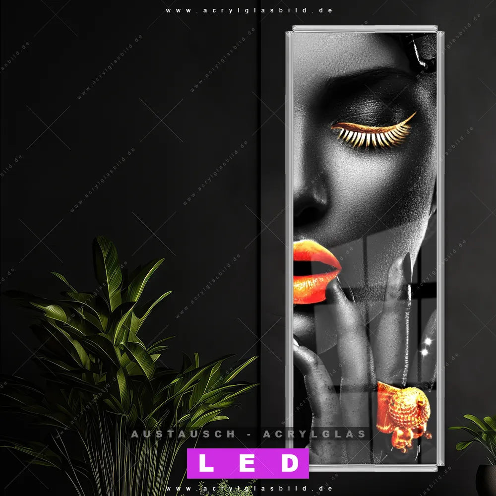 Begriffe wie Frau, Lippen, Mund, Porträt, Erotik, modern, Gold, Silber, Farbe, Beauty haben dich auf der Suche nach deinem neuen Austausch-Acrylglasbild inspiriert? Dann sollte das Wechsel-Acrylglasbild schwarz-weiß Porträt mit Farbakzenten für dein bereits vorhandenes LED Acrylglasbild Canvalight® DIA den Weg zu dir finden.