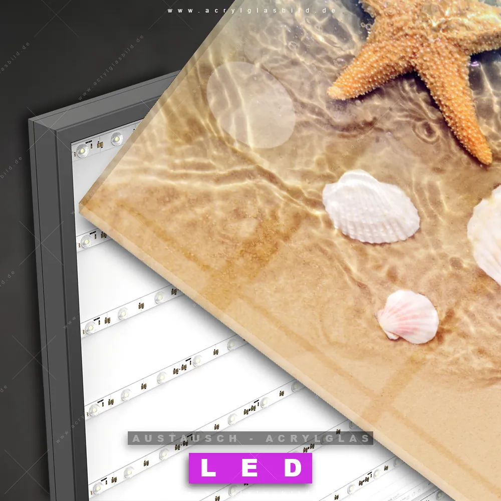 Begriffe wie Meer, Strand, Sand, Ozean, Wasser, Karibik, Urlaub, Reisen, Muscheln, Seesterne haben dich auf der Suche nach deinem neuen Austausch-Acrylglasbild inspiriert? Dann sollte das Wechsel-Acrylglasbild Seestern am Strand mit Muscheln für dein bereits vorhandenes LED Acrylglasbild Canvalight® DIA den Weg zu dir finden.