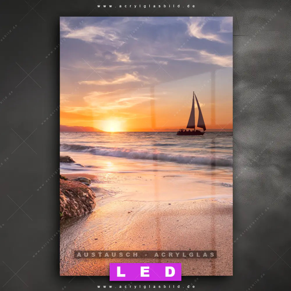 Begriffe wie Wasser, Ozean, Küste, Horizont, Sommer, Sonnenaufgang, Sonnenuntergang, Urlaub, Reisen, Boot, Segelboot, Felsen, Strand haben dich auf der Suche nach deinem neuen Austausch-Acrylglasbild inspiriert? Dann sollte das Wechsel-Acrylglasbild Romantische Meeresstimmung mit Seegelboot für dein bereits vorhandenes LED Acrylglasbild Canvalight® DIA den Weg zu dir finden.