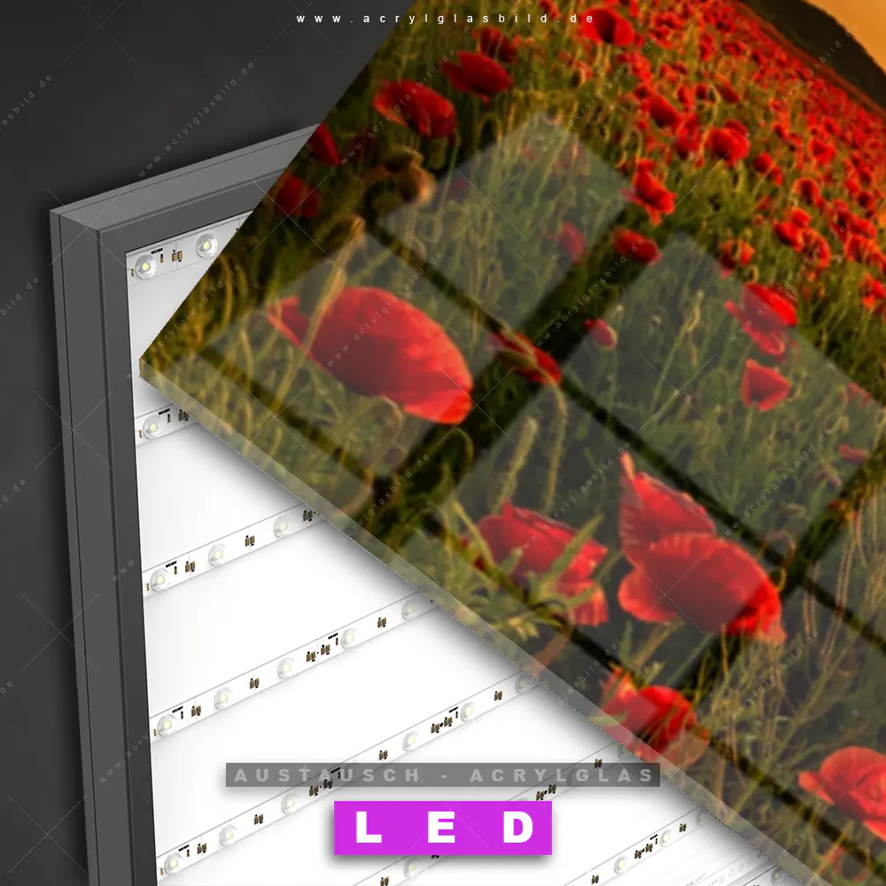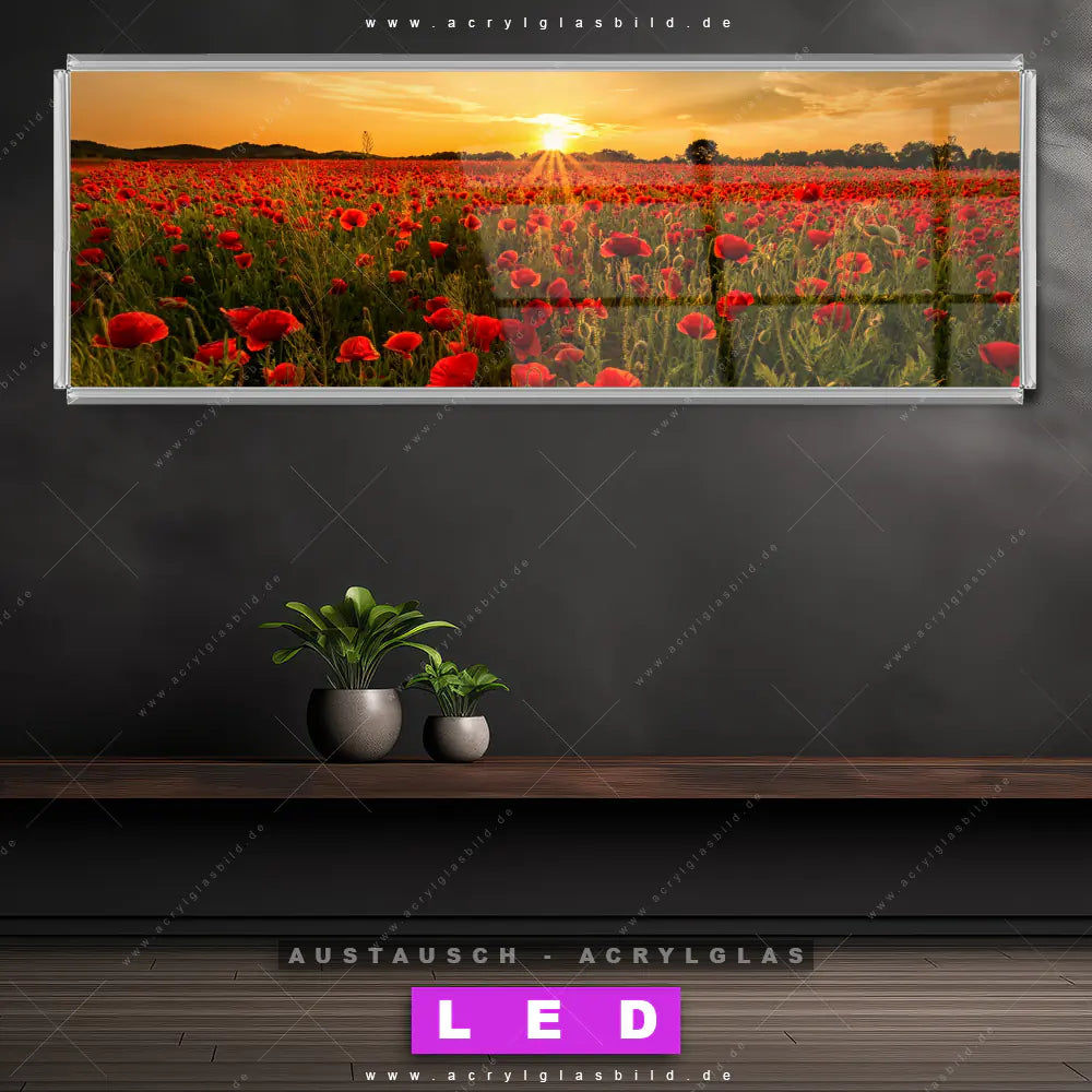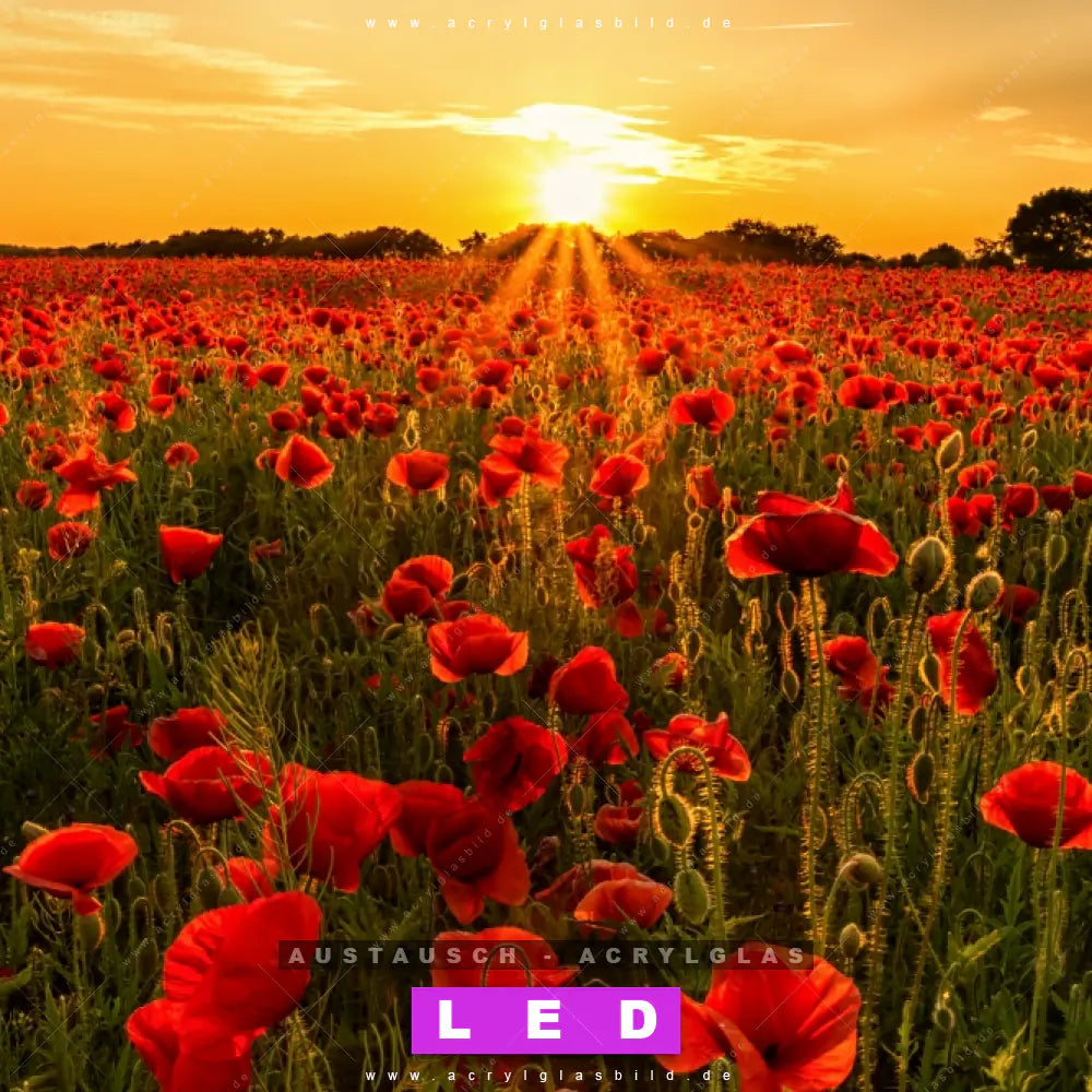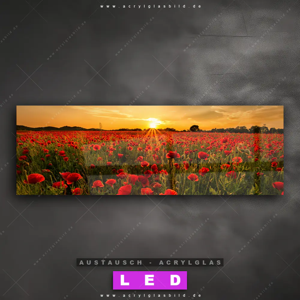 Begriffe wie Blume, Botanik, Pflanze, Natur, Mohn, Mohnblume, Wiese, Feld, Blüte, Blumen, Klatschmohn, Sonnenaufgang, Sonnenuntergang, Blumenwiese haben dich auf der Suche nach deinem neuen Austausch-Acrylglasbild inspiriert? Dann sollte das Wechsel-Acrylglasbild Sonnenuntergang über Mohnfeld für dein bereits vorhandenes LED Acrylglasbild Canvalight® DIA den Weg zu dir finden.