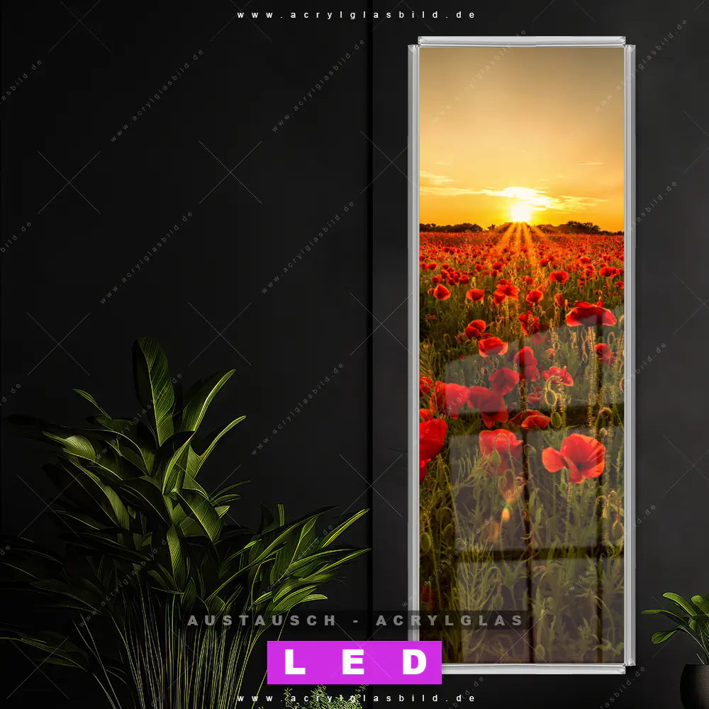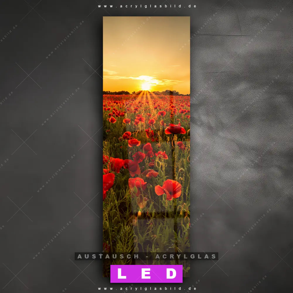 Begriffe wie Blume, Botanik, Pflanze, Natur, Mohn, Mohnblume, Wiese, Feld, Blüte, Blumen, Klatschmohn, Sonnenaufgang, Sonnenuntergang, Blumenwiese haben dich auf der Suche nach deinem neuen Austausch-Acrylglasbild inspiriert? Dann sollte das Wechsel-Acrylglasbild Sonnenuntergang über Mohnfeld für dein bereits vorhandenes LED Acrylglasbild Canvalight® DIA den Weg zu dir finden.