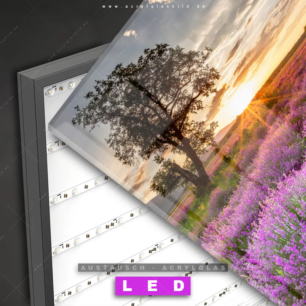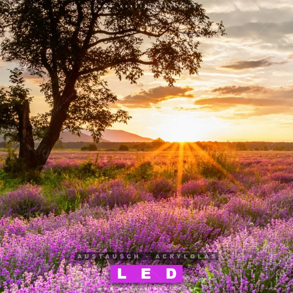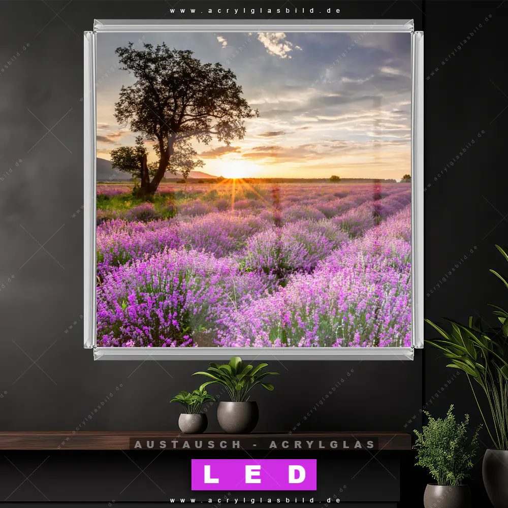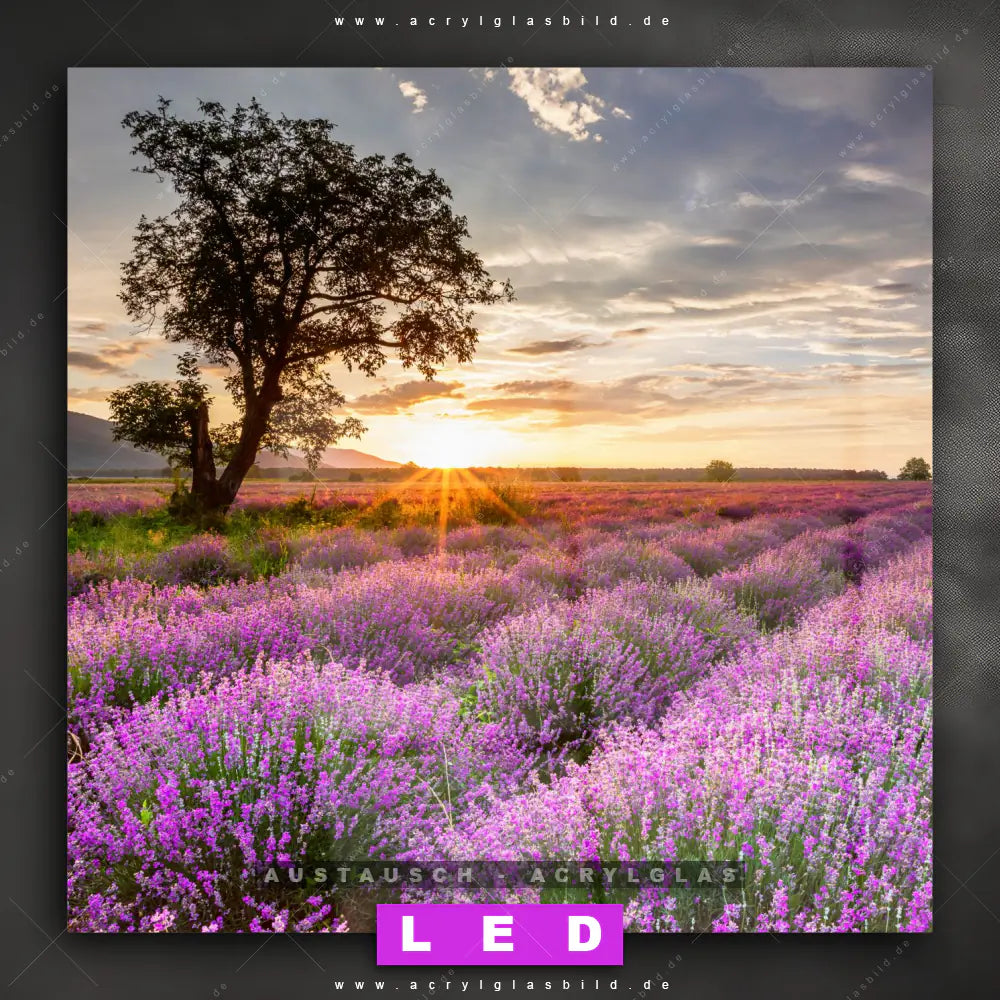 Begriffe wie Blumen, Baum, Feld, Sonnenuntergang, Wiese, Himmel, Sonnenaufgang, Lavendel, Natur haben dich auf der Suche nach deinem neuen Austausch-Acrylglasbild inspiriert? Dann sollte das Wechsel-Acrylglasbild Lavendelfelder in der Provence für dein bereits vorhandenes LED Acrylglasbild Canvalight® DIA den Weg zu dir finden.