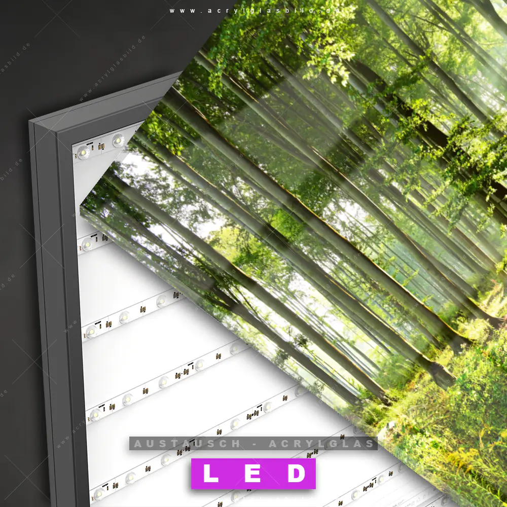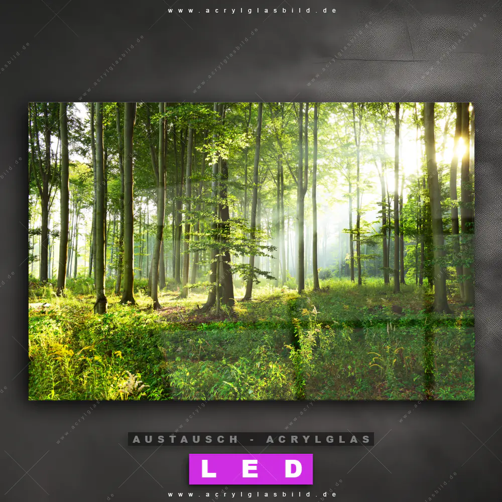 Begriffe wie Wald, Baum, Natur, Sonne, Sonnenstrahlen, Licht, Sonnenschein, Bäume, Laubwald, Sonnenlicht haben dich auf der Suche nach deinem neuen Austausch-Acrylglasbild inspiriert? Dann sollte das Wechsel-Acrylglasbild Grüner Wald und Sonnenlicht für dein bereits vorhandenes LED Acrylglasbild Canvalight® DIA den Weg zu dir finden.