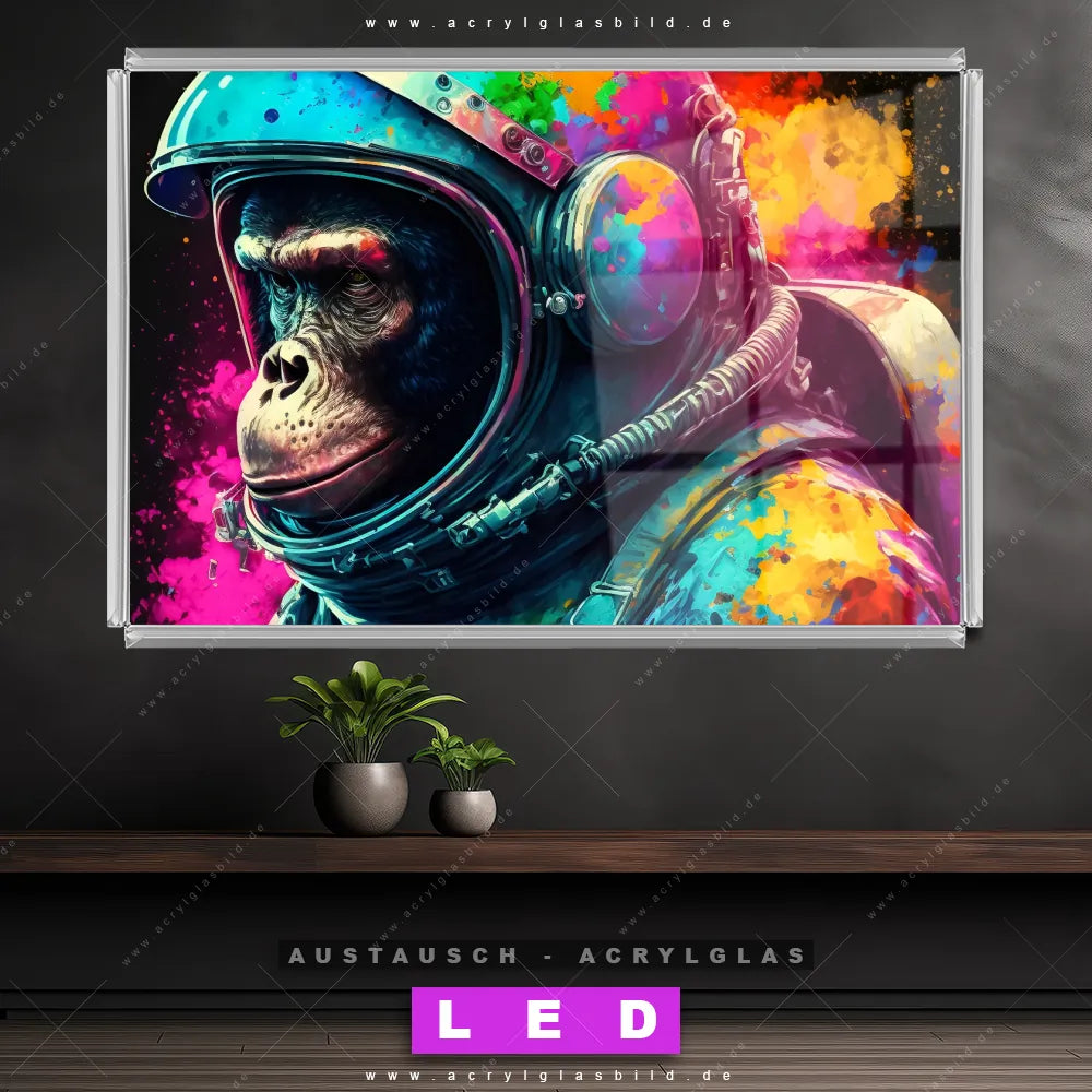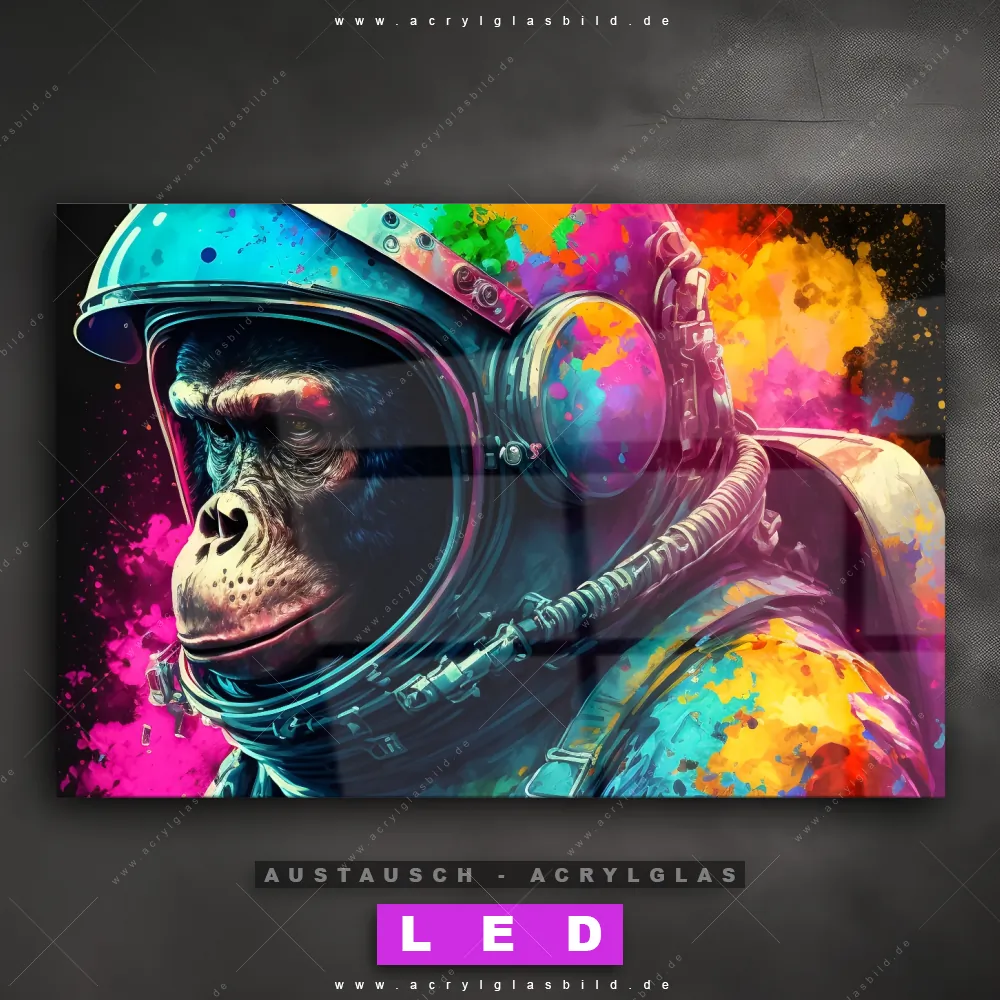 Begriffe wie Tier, Affe, Monkey, Chimpanzee, Schimpanse, Farbe, Farbspritzer, Austronaut, Weltall, Space haben dich auf der Suche nach deinem neuen Austausch-Acrylglasbild inspiriert? Dann sollte das Wechsel-Acrylglasbild Schimpanse in bunten Farben als Astronaut für dein bereits vorhandenes LED Acrylglasbild Canvalight® DIA den Weg zu dir finden.
