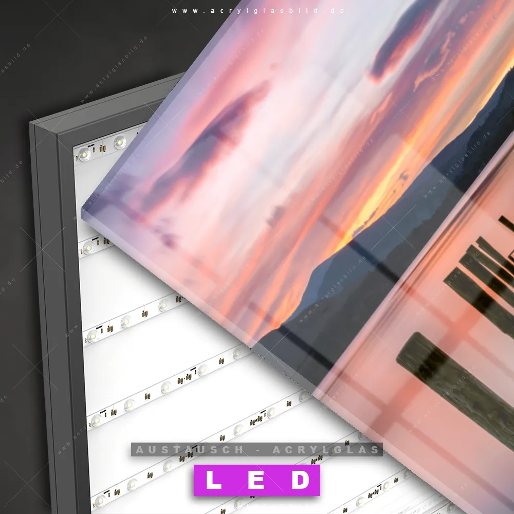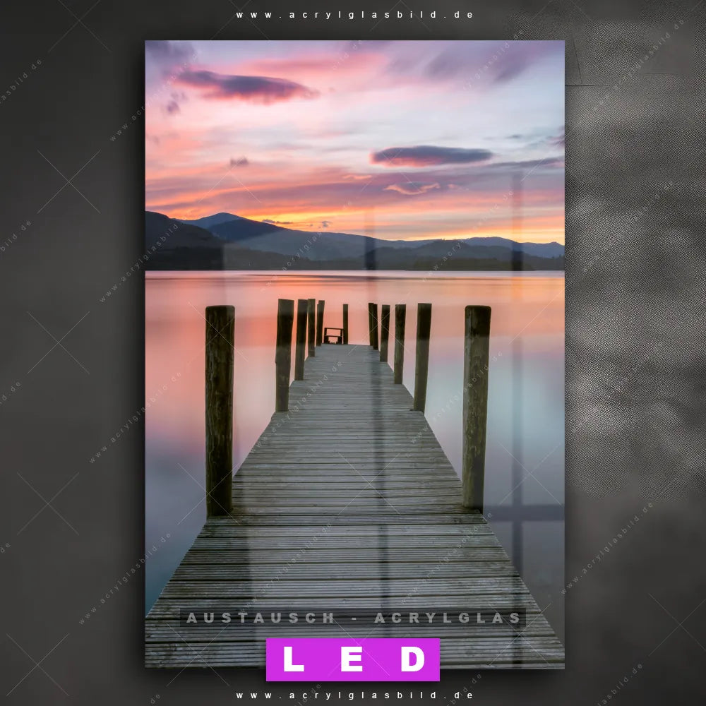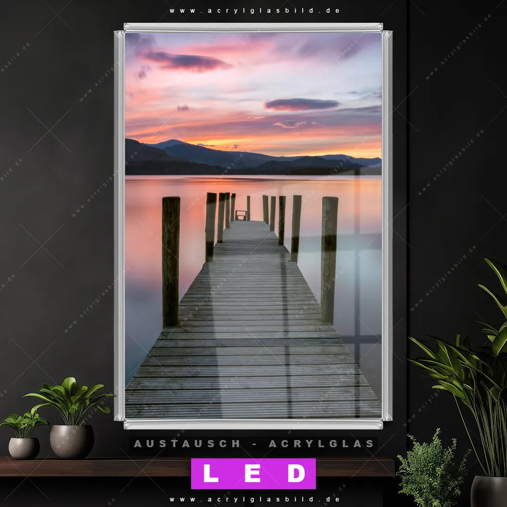 Begriffe wie Wasser, Horizont, Landschaft, Urlaub, Reisen, Pier, Steg, Sonnenuntergang, Sonnenaufgang, Natur, See, Berge, Bergsee haben dich auf der Suche nach deinem neuen Austausch-Acrylglasbild inspiriert? Dann sollte das Wechsel-Acrylglasbild stilles Wasser im Sonnenuntergang für dein bereits vorhandenes LED Acrylglasbild Canvalight® DIA den Weg zu dir finden.