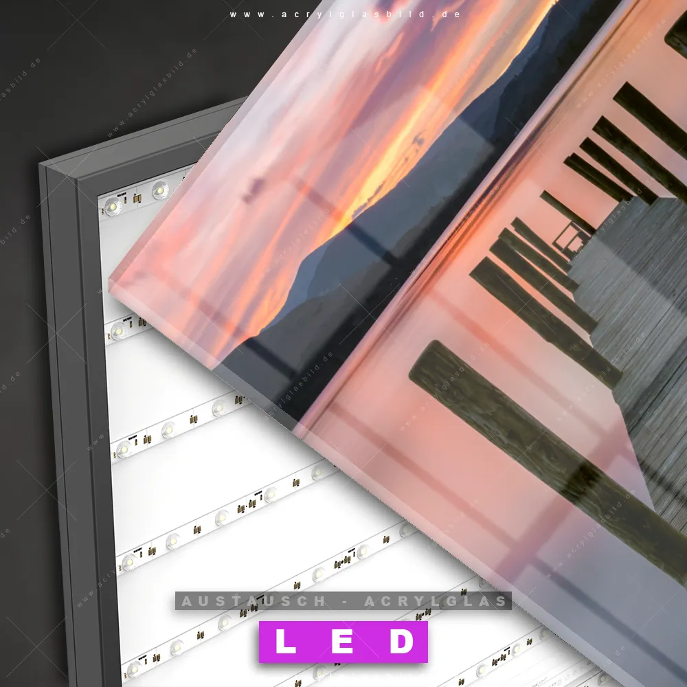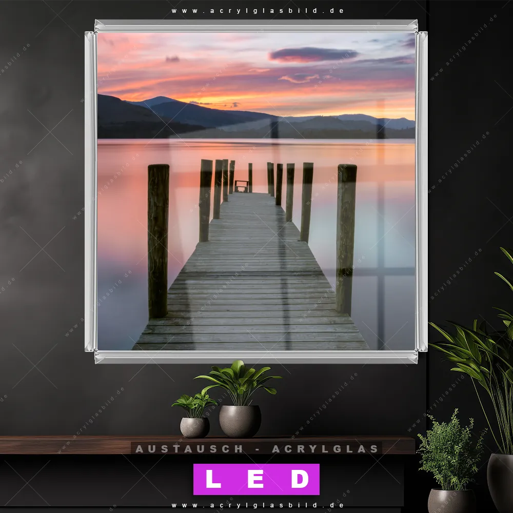 Begriffe wie Wasser, Horizont, Landschaft, Urlaub, Reisen, Pier, Steg, Sonnenuntergang, Sonnenaufgang, Natur, See, Berge, Bergsee haben dich auf der Suche nach deinem neuen Austausch-Acrylglasbild inspiriert? Dann sollte das Wechsel-Acrylglasbild stilles Wasser im Sonnenuntergang für dein bereits vorhandenes LED Acrylglasbild Canvalight® DIA den Weg zu dir finden.