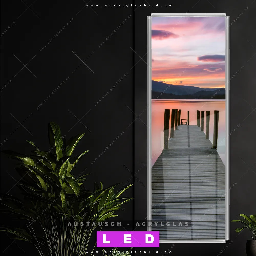 Begriffe wie Wasser, Horizont, Landschaft, Urlaub, Reisen, Pier, Steg, Sonnenuntergang, Sonnenaufgang, Natur, See, Berge, Bergsee haben dich auf der Suche nach deinem neuen Austausch-Acrylglasbild inspiriert? Dann sollte das Wechsel-Acrylglasbild stilles Wasser im Sonnenuntergang für dein bereits vorhandenes LED Acrylglasbild Canvalight® DIA den Weg zu dir finden.