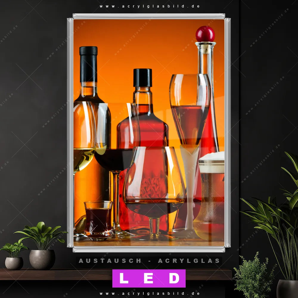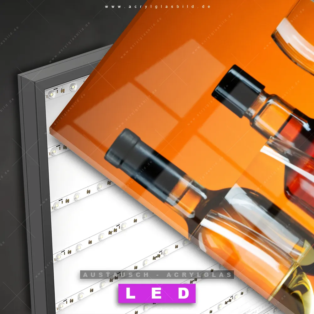 Begriffe wie Flaschen, Glas, Getränke, Wein, Whiskey, Bier, Cognac, Likör, Alkohol haben dich auf der Suche nach deinem neuen Austausch-Acrylglasbild inspiriert? Dann sollte das Wechsel-Acrylglasbild Genuss am Abend für dein bereits vorhandenes LED Acrylglasbild Canvalight® DIA den Weg zu dir finden.