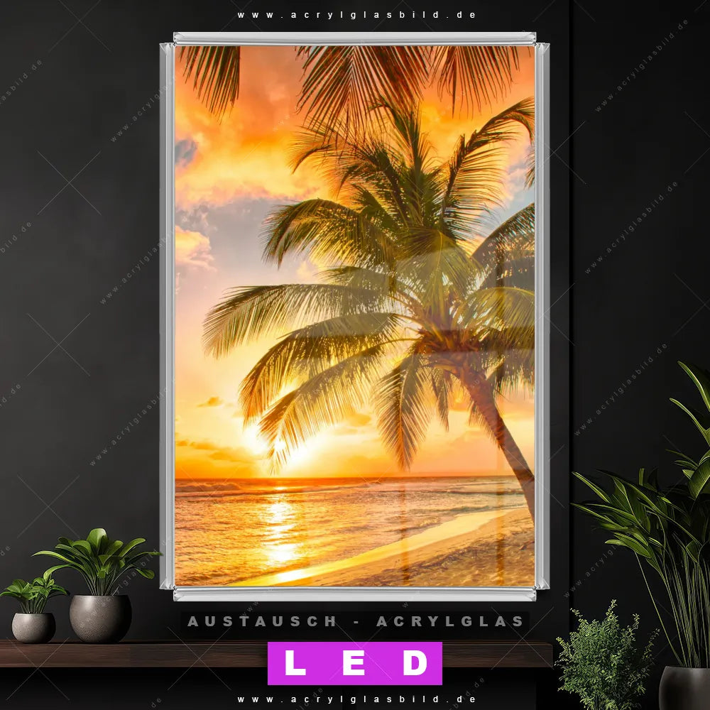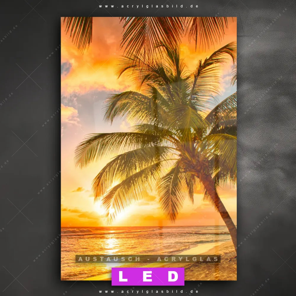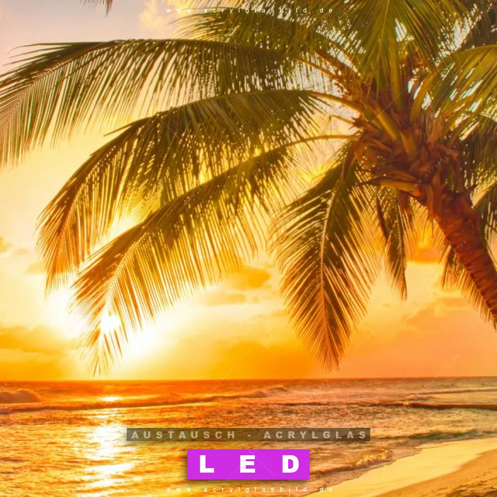 Begriffe wie Horizont, Palmen, Insel, Sommer, Südsee - Karibik, Urlaub - Reisen, Sonnenuntergang - Sonnenaufgang haben dich auf der Suche nach deinem neuen Austausch-Acrylglasbild inspiriert? Dann sollte das Wechsel-Acrylglasbild Palmen bei Sonnenuntergang für dein bereits vorhandenes LED Acrylglasbild Canvalight® DIA den Weg zu dir finden.