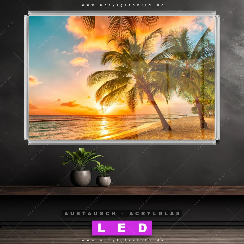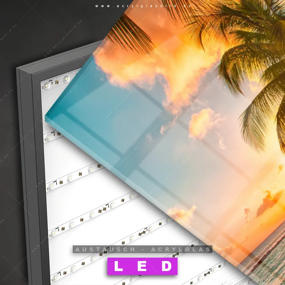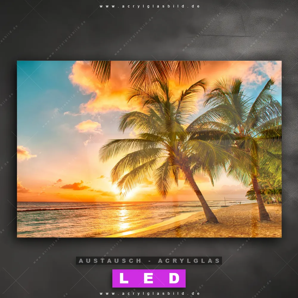 Begriffe wie Horizont, Palmen, Insel, Sommer, Südsee - Karibik, Urlaub - Reisen, Sonnenuntergang - Sonnenaufgang haben dich auf der Suche nach deinem neuen Austausch-Acrylglasbild inspiriert? Dann sollte das Wechsel-Acrylglasbild Palmen bei Sonnenuntergang für dein bereits vorhandenes LED Acrylglasbild Canvalight® DIA den Weg zu dir finden.