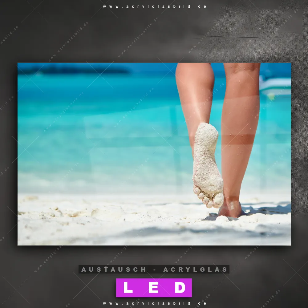 Begriffe wie Frau, Strand, Meer, Fuß, Sommer, Südsee - Karibik, Urlaub - Reisen haben dich auf der Suche nach deinem neuen Austausch-Acrylglasbild inspiriert? Dann sollte das Wechsel-Acrylglasbild Frau mit nackten Füßen am tropisch weißen Strand für dein bereits vorhandenes LED Acrylglasbild Canvalight® DIA den Weg zu dir finden.