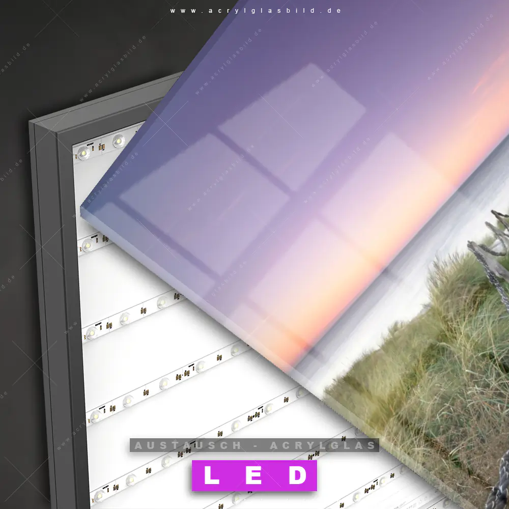 Begriffe wie Weg, Pier, Deutschland, Sommer, Frühling, Ostsee, Nordsee, Sonnenuntergang, Sonnenaufgang, Natur, Urlaub, Reisen, Meer, Strand haben dich auf der Suche nach deinem neuen Austausch-Acrylglasbild inspiriert? Dann sollte das Wechsel-Acrylglasbild Abendstimmung am Meer für dein bereits vorhandenes LED Acrylglasbild Canvalight® DIA den Weg zu dir finden.