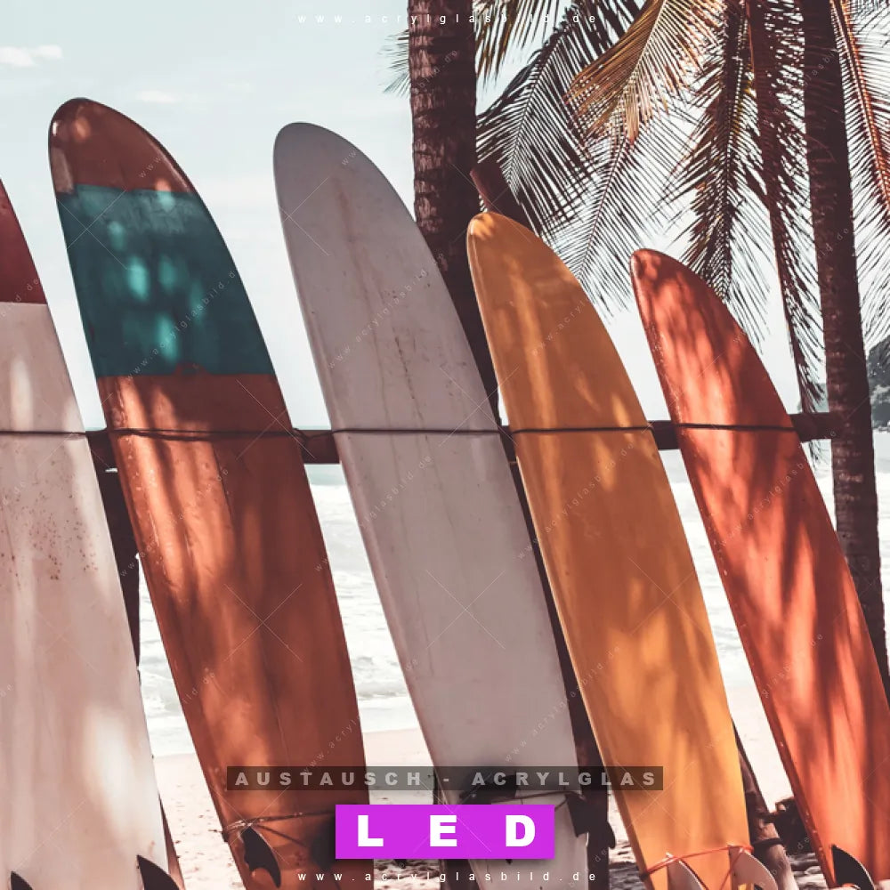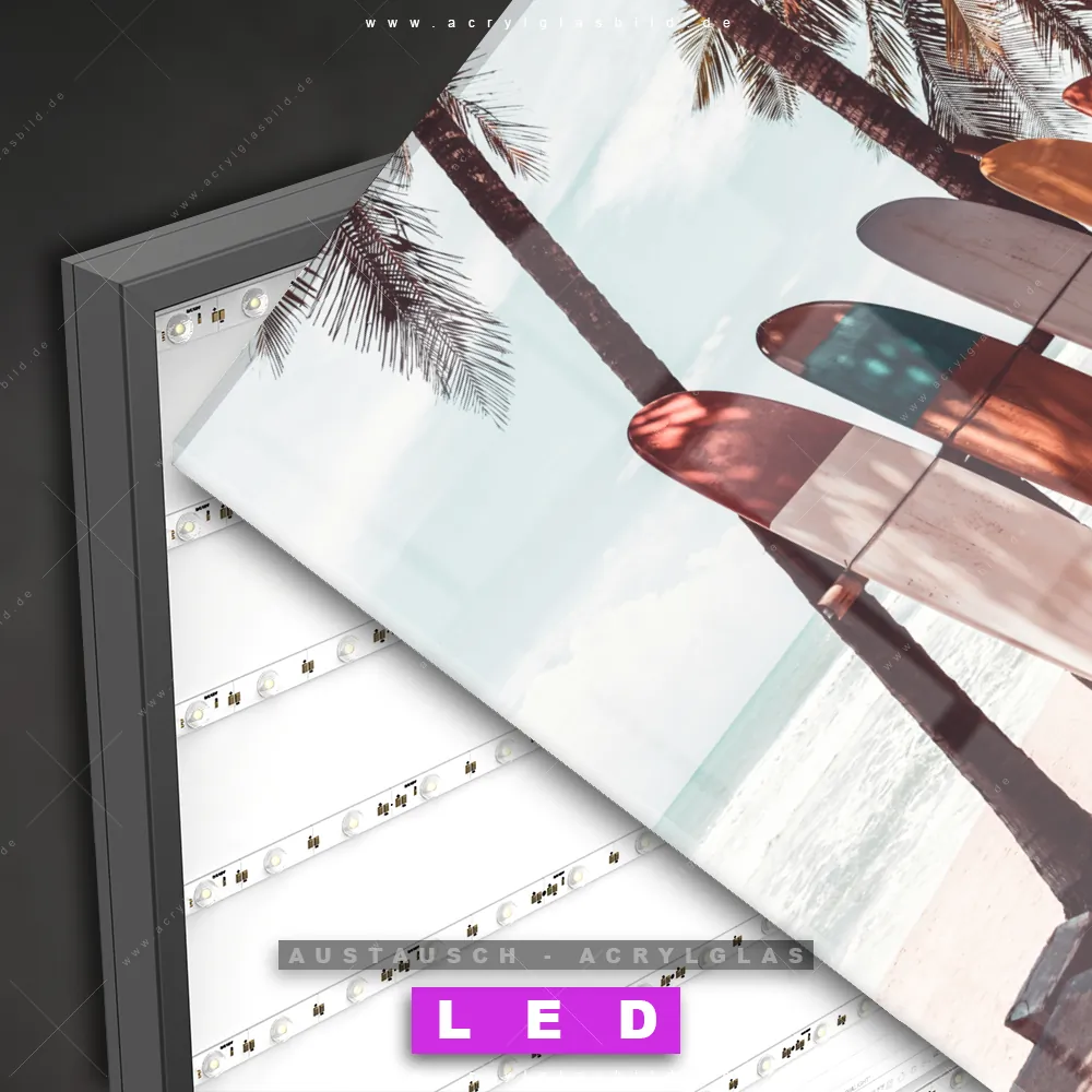 Begriffe wie Ozean, Wasser, Küste, Sand, Palmen, Surfbretter, Sommer, Urlaub - Reisen, Südsee - Karibik, Wellen -Surfen haben dich auf der Suche nach deinem neuen Austausch-Acrylglasbild inspiriert? Dann sollte das Wechsel-Acrylglasbild Surfer-Life für dein bereits vorhandenes LED Acrylglasbild Canvalight® DIA den Weg zu dir finden.