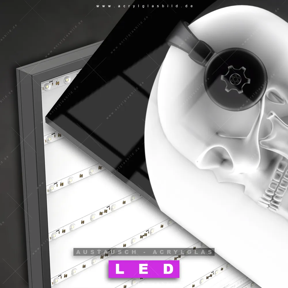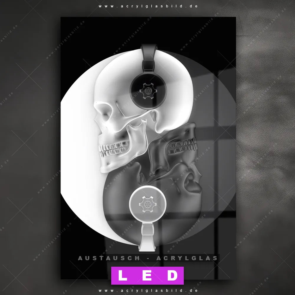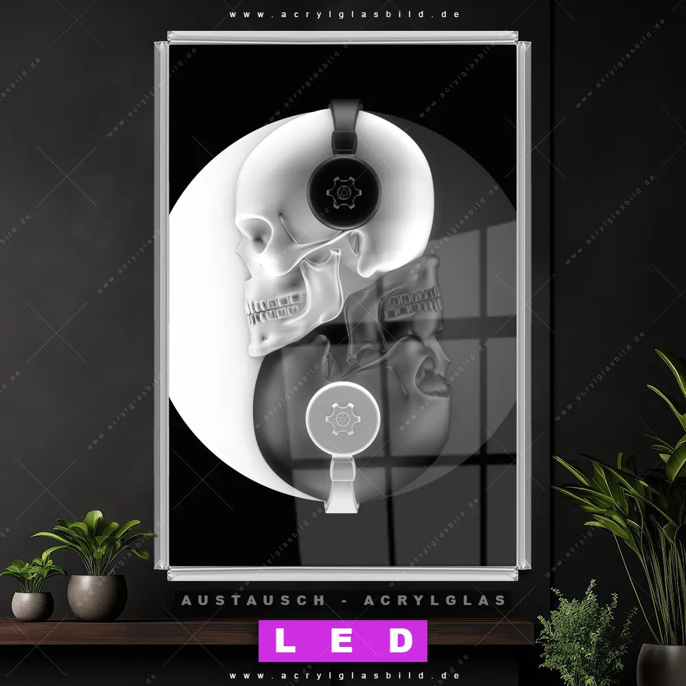 Begriffe wie Schädel, Totenkopf, Skelett, Yin Yang, Feng Shui, Kopfhörer, Musik haben dich auf der Suche nach deinem neuen Austausch-Acrylglasbild inspiriert? Dann sollte das Wechsel-Acrylglasbild Totenköpfe mit Kopfhörern für dein bereits vorhandenes LED Acrylglasbild Canvalight® DIA den Weg zu dir finden.