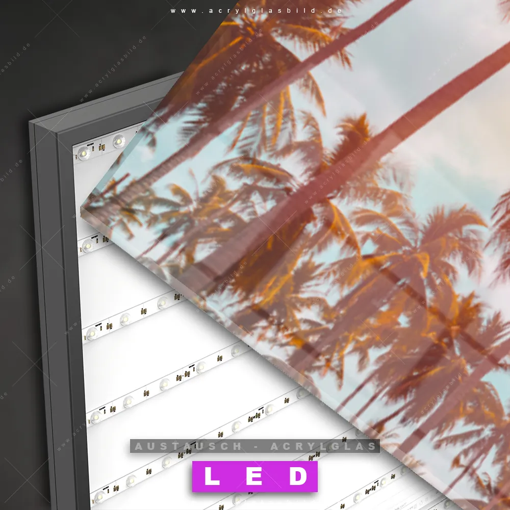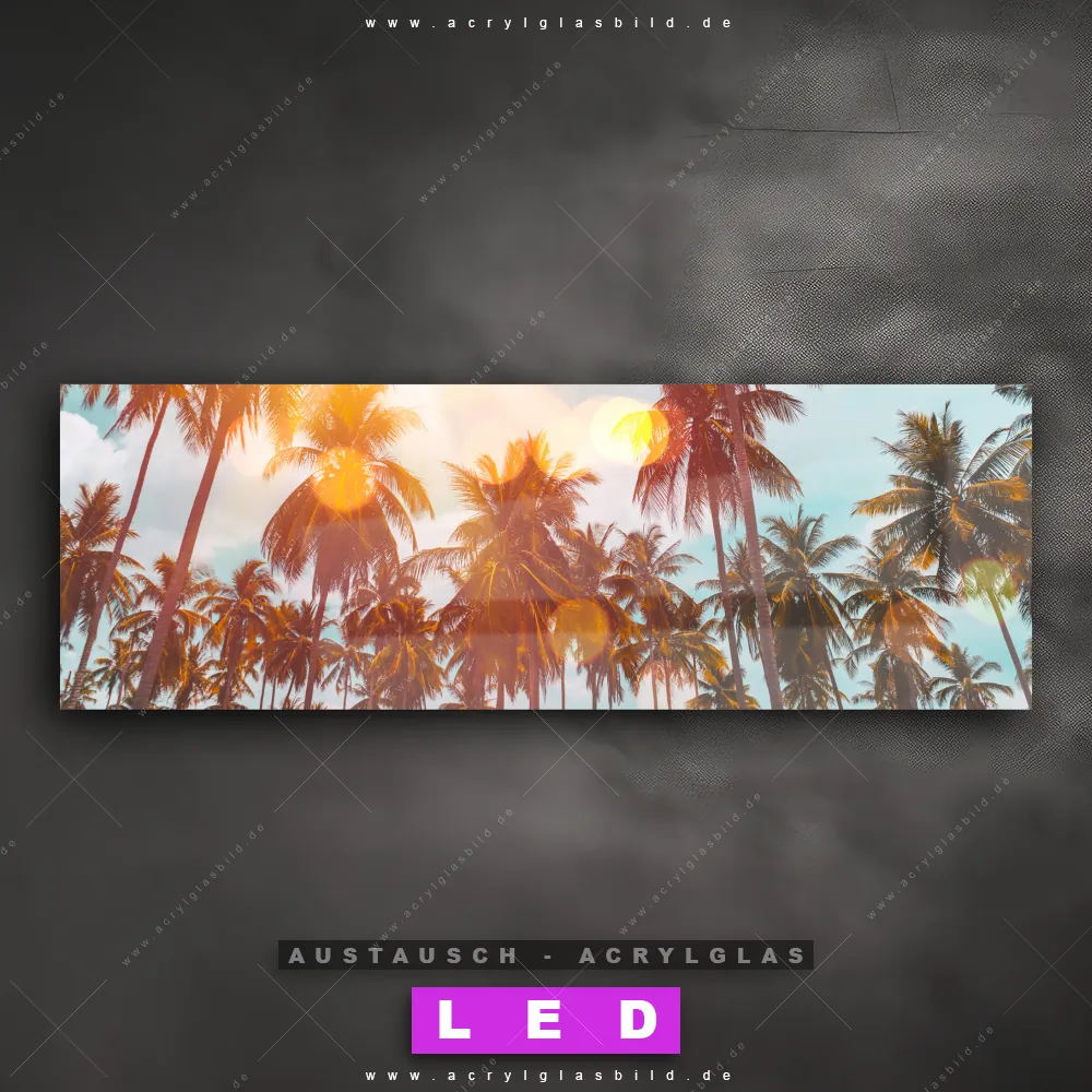 Begriffe wie Palmen, Tropen, Insel, Sommer, Südsee - Karibik, Urlaub - Reisen, Sonnenuntergang - Sonnenaufgang haben dich auf der Suche nach deinem neuen Austausch-Acrylglasbild inspiriert? Dann sollte das Wechsel-Acrylglasbild Palmen mit Lichtreflektionen für dein bereits vorhandenes LED Acrylglasbild Canvalight® DIA den Weg zu dir finden.