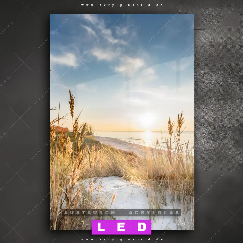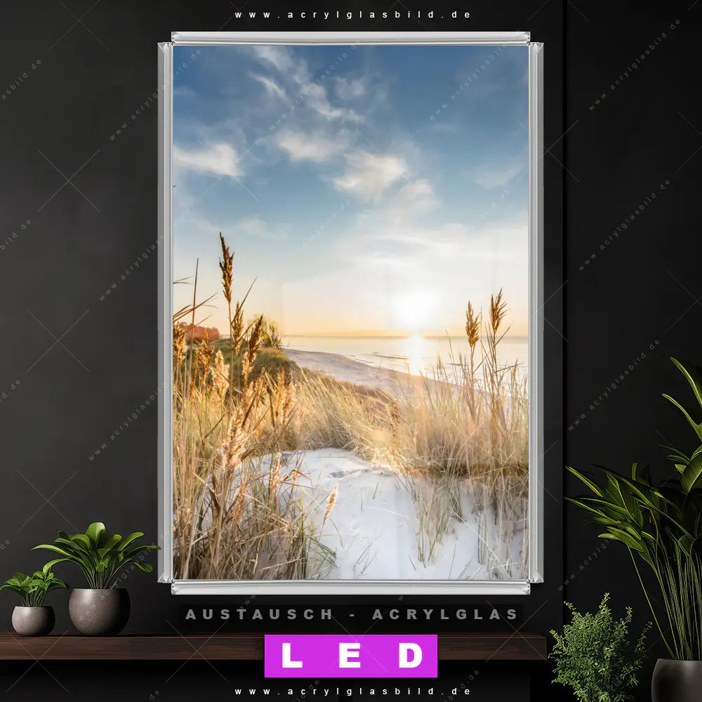 Begriffe wie Deutschland, Sommer, Dünen, Gräser, Urlaub, Reisen, Ostsee, Nordsee, Strand, Meer, Sonnenuntergang, Sonnenaufgang haben dich auf der Suche nach deinem neuen Austausch-Acrylglasbild inspiriert? Dann sollte das Wechsel-Acrylglasbild Morgendämmerung am Strand für dein bereits vorhandenes LED Acrylglasbild Canvalight® DIA den Weg zu dir finden.
