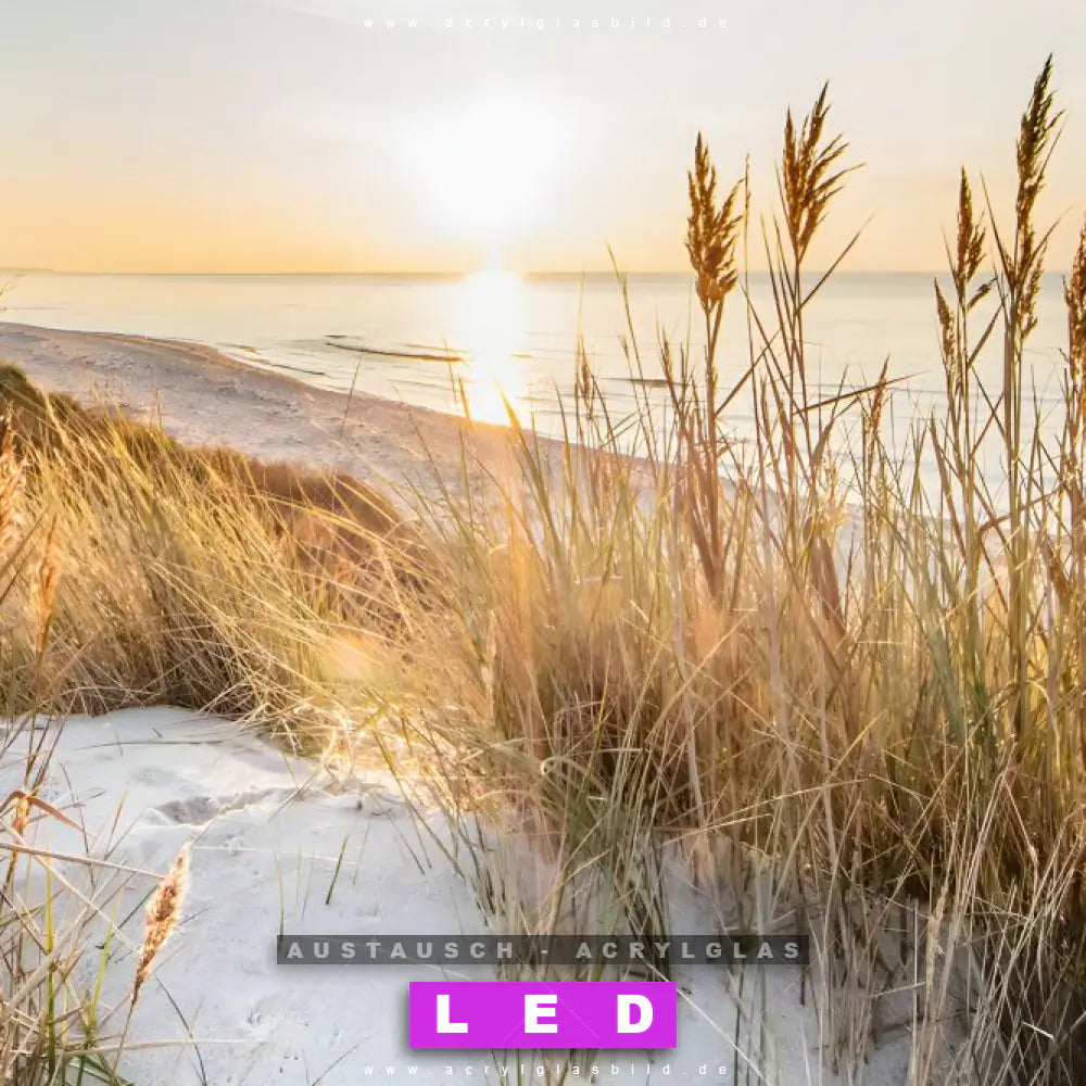 Begriffe wie Deutschland, Sommer, Dünen, Gräser, Urlaub, Reisen, Ostsee, Nordsee, Strand, Meer, Sonnenuntergang, Sonnenaufgang haben dich auf der Suche nach deinem neuen Austausch-Acrylglasbild inspiriert? Dann sollte das Wechsel-Acrylglasbild Morgendämmerung am Strand für dein bereits vorhandenes LED Acrylglasbild Canvalight® DIA den Weg zu dir finden.