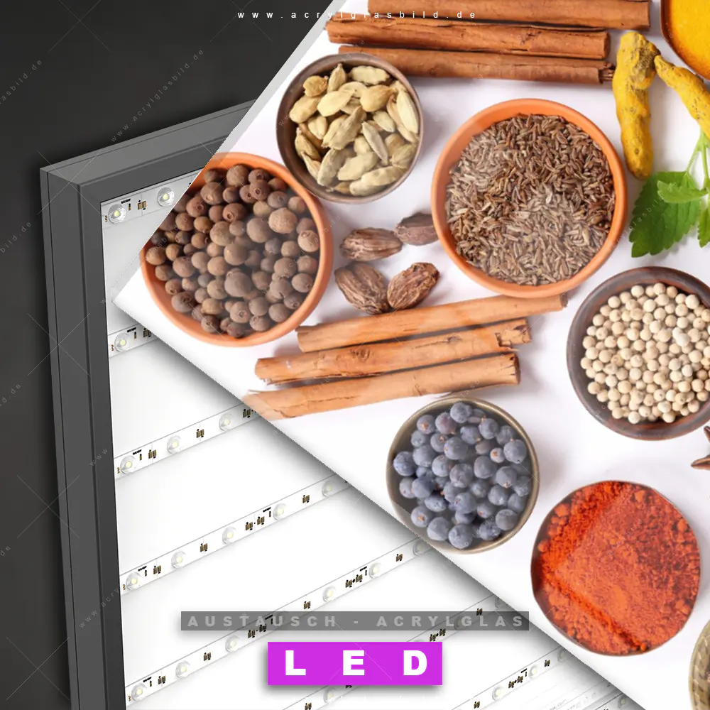 Begriffe wie Gewürze, Kräuter, Lebensmittel, Geschmack, Indien, Zimt, Curry, Paprika, kochen, Küche, Essen, Ernährung haben dich auf der Suche nach deinem neuen Austausch-Acrylglasbild inspiriert? Dann sollte das Wechsel-Acrylglasbild Gewürze in der Küche für dein bereits vorhandenes LED Acrylglasbild Canvalight® DIA den Weg zu dir finden.