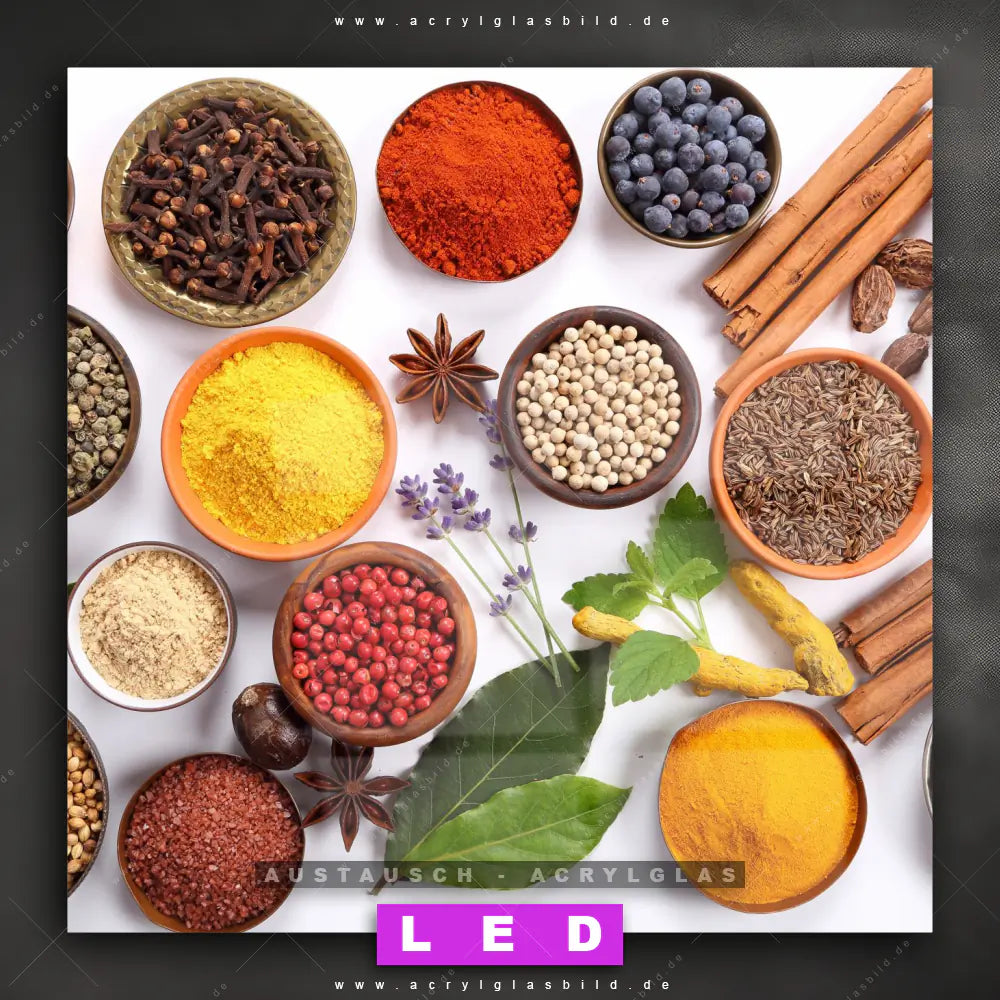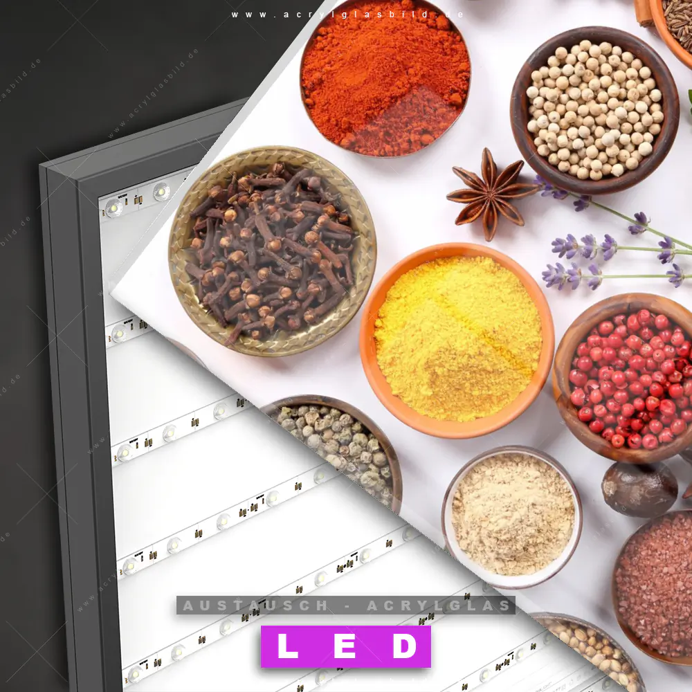 Begriffe wie Gewürze, Kräuter, Lebensmittel, Geschmack, Indien, Zimt, Curry, Paprika, kochen, Küche, Essen, Ernährung haben dich auf der Suche nach deinem neuen Austausch-Acrylglasbild inspiriert? Dann sollte das Wechsel-Acrylglasbild Gewürze in der Küche für dein bereits vorhandenes LED Acrylglasbild Canvalight® DIA den Weg zu dir finden.