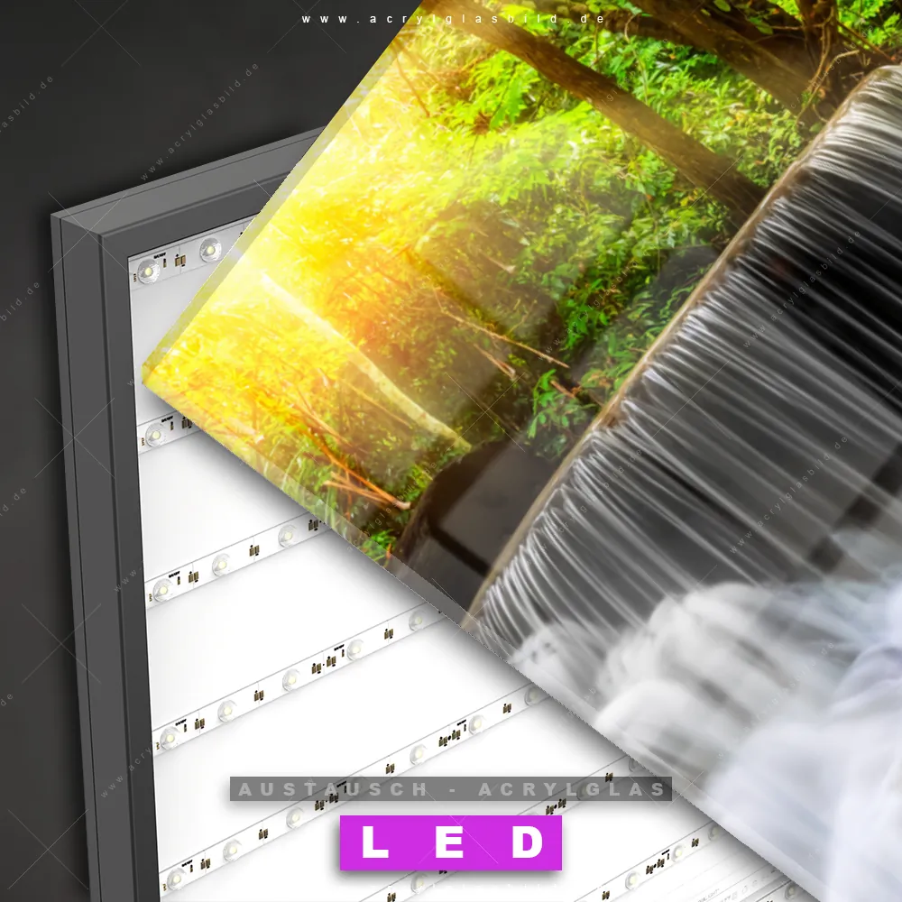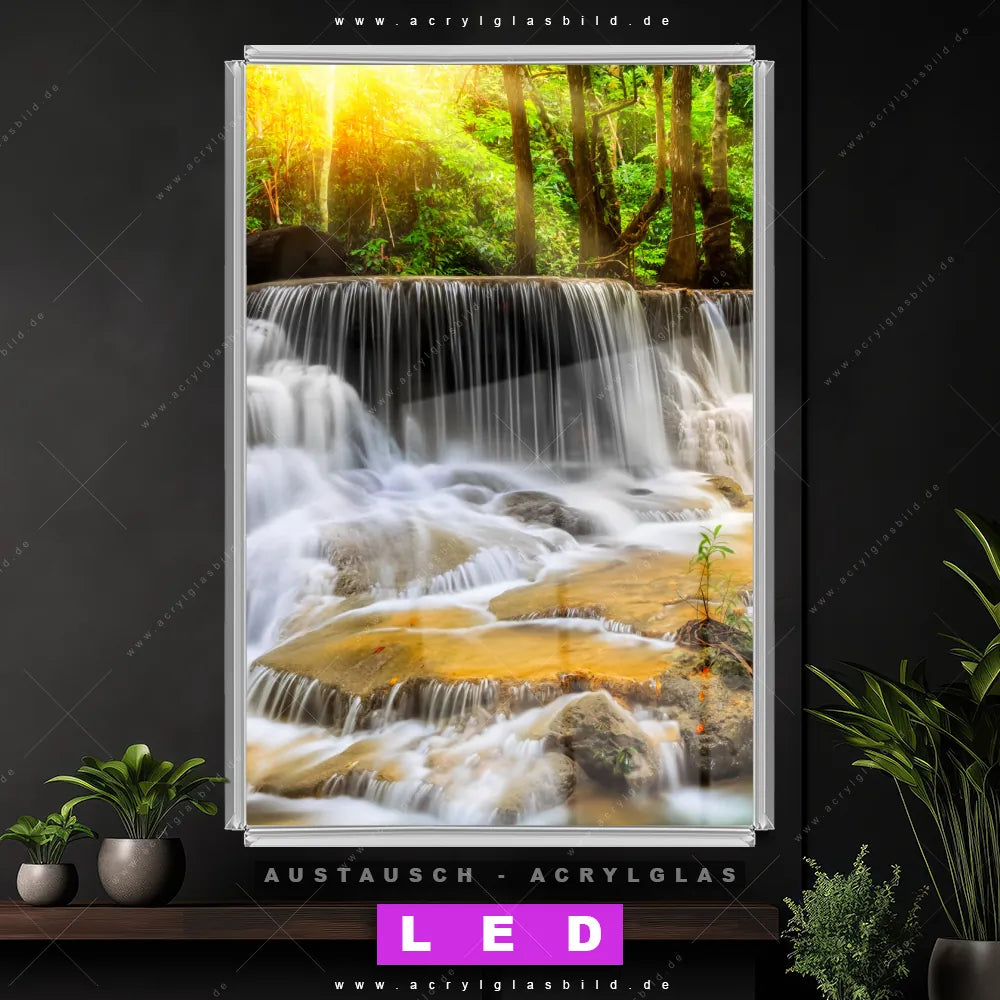Begriffe wie Yoga, Landschaft, Natur, Sonne, Wald, Wasserfälle, Gewässer haben dich auf der Suche nach deinem neuen Austausch-Acrylglasbild inspiriert? Dann sollte das Wechsel-Acrylglasbild Wasserfälle im Urwald für dein bereits vorhandenes LED Acrylglasbild Canvalight® DIA den Weg zu dir finden.