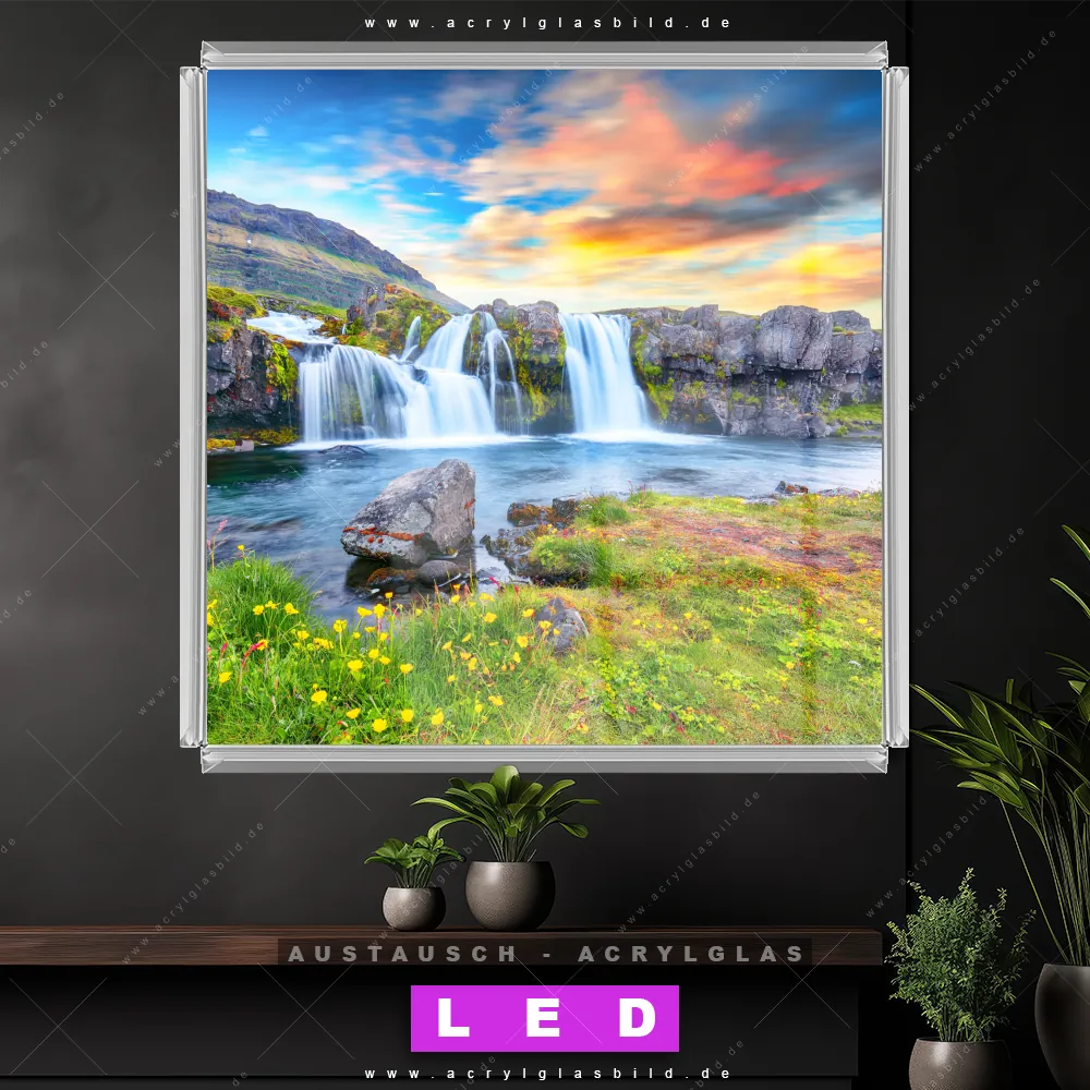 Wechsel-Acrylglas Canvalight® DIA | Wasserfall bei Sonnenuntergang | Quadrat