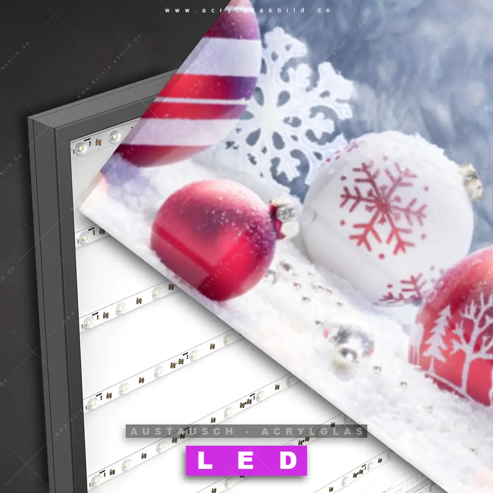 Begriffe wie Weihnachten, Geschenke, Weihnachtskugeln, Christbaumkugeln, Tannenzweige, Winter, Schneeflocken, Schnee, Tannenzapfen haben dich auf der Suche nach deinem neuen Austausch-Acrylglasbild inspiriert? Dann sollte das Wechsel-Acrylglasbild Festliche Christbaumkugeln im Winter für dein bereits vorhandenes LED Acrylglasbild Canvalight® DIA den Weg zu dir finden.