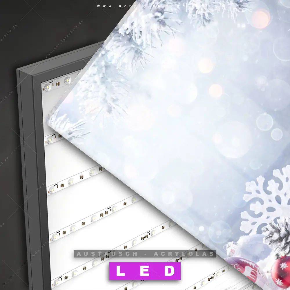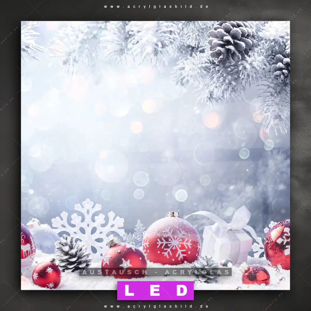Begriffe wie Weihnachten, Geschenke, Weihnachtskugeln, Christbaumkugeln, Tannenzweige, Winter, Schneeflocken, Schnee, Tannenzapfen haben dich auf der Suche nach deinem neuen Austausch-Acrylglasbild inspiriert? Dann sollte das Wechsel-Acrylglasbild Festliche Christbaumkugeln im Winter für dein bereits vorhandenes LED Acrylglasbild Canvalight® DIA den Weg zu dir finden.