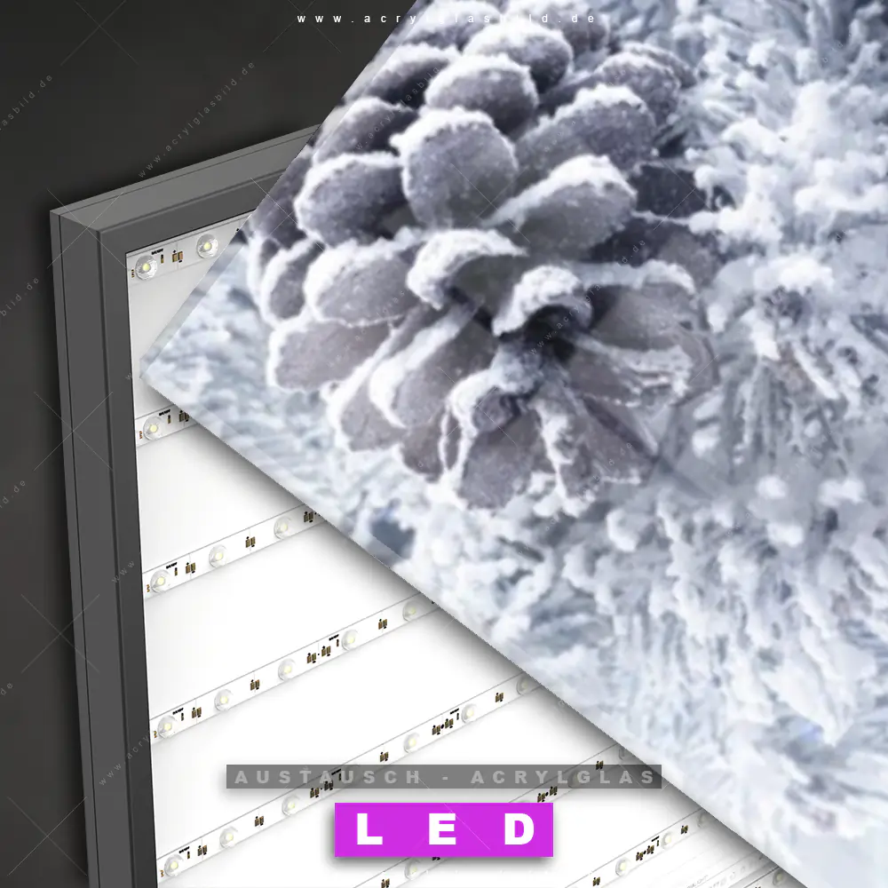 Begriffe wie Weihnachten, Geschenke, Weihnachtskugeln, Christbaumkugeln, Tannenzweige, Winter, Schneeflocken, Schnee, Tannenzapfen haben dich auf der Suche nach deinem neuen Austausch-Acrylglasbild inspiriert? Dann sollte das Wechsel-Acrylglasbild Festliche Christbaumkugeln im Winter für dein bereits vorhandenes LED Acrylglasbild Canvalight® DIA den Weg zu dir finden.