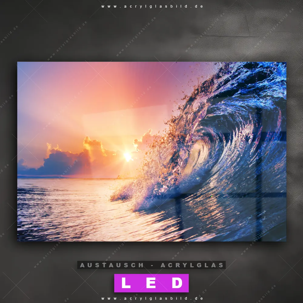 Begriffe wie Wasser, Ozean, Küste, Horizont, Sommer, Südsee - Karibik, Urlaub - Reisen, Sonnenuntergang - Sonnenaufgang, Wellen -Surfen haben dich auf der Suche nach deinem neuen Austausch-Acrylglasbild inspiriert? Dann sollte das Wechsel-Acrylglasbild Surferwelle für dein bereits vorhandenes LED Acrylglasbild Canvalight® DIA den Weg zu dir finden.