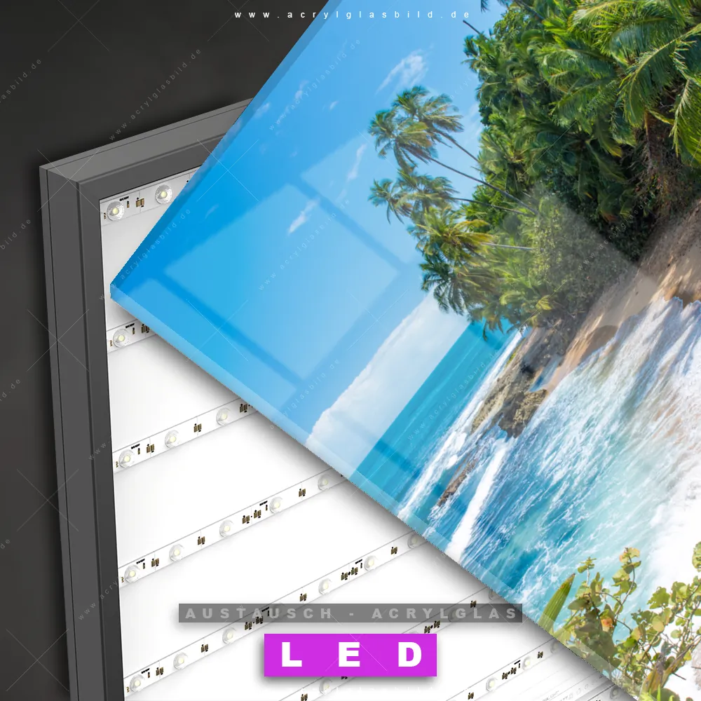 Begriffe wie Sand, Ozean, Wasser, Küste, Horizont, Kokospalme, Bucht, Insel, Lagune, Felsen, Palmen, Sommer, Südsee - Karibik, Urlaub - Reisen haben dich auf der Suche nach deinem neuen Austausch-Acrylglasbild inspiriert? Dann sollte das Wechsel-Acrylglasbild Tropischer Strand für dein bereits vorhandenes LED Acrylglasbild Canvalight® DIA den Weg zu dir finden.