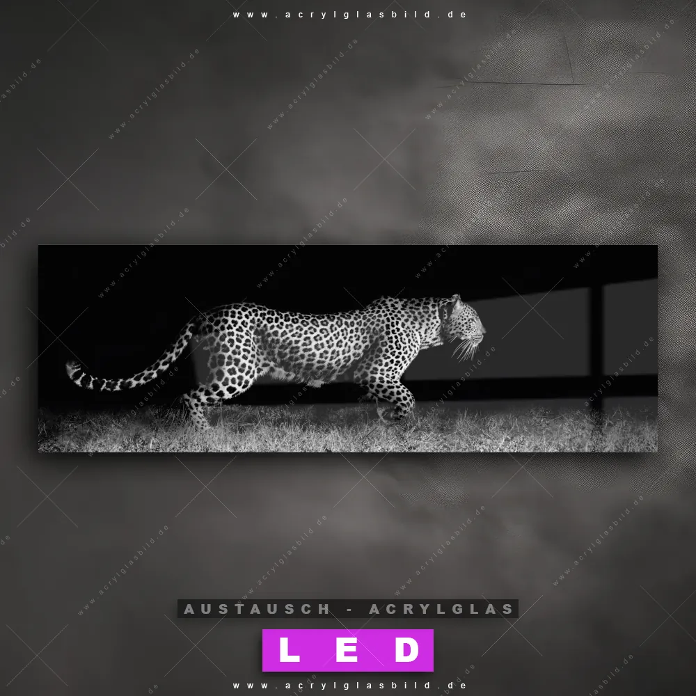 Begriffe wie Raubkatze, Leopard, Afrika, Dschungel, wild, Safari, frei, Nacht, dunkel haben dich auf der Suche nach deinem neuen Austausch-Acrylglasbild inspiriert? Dann sollte das Wechsel-Acrylglasbild Leopard schwarz-weiß für dein bereits vorhandenes LED Acrylglasbild Canvalight® DIA den Weg zu dir finden.