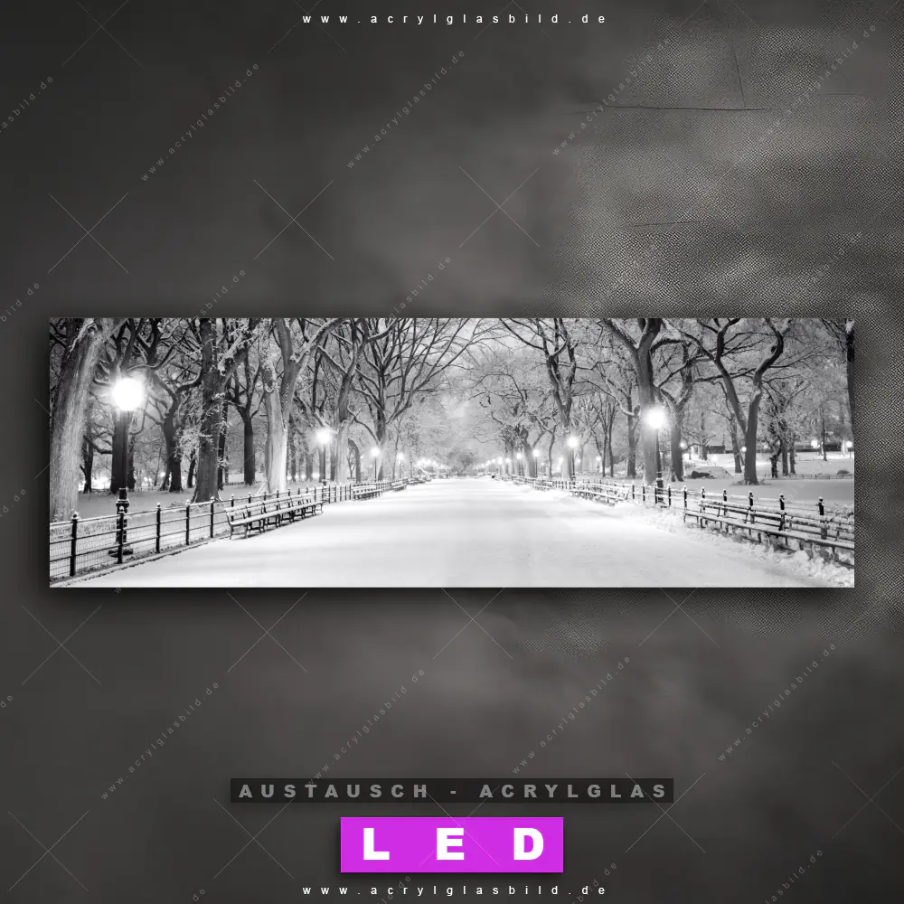 Begriffe wie Stadt, Skyline, Manhattan, New York, Amerika, Metropole, USA, Nacht, Abend, Reisen, Urlaub, Park, Weg, Laternen haben dich auf der Suche nach deinem neuen Austausch-Acrylglasbild inspiriert? Dann sollte das Wechsel-Acrylglasbild Verschneiter Parkweg für dein bereits vorhandenes LED Acrylglasbild Canvalight® DIA den Weg zu dir finden.