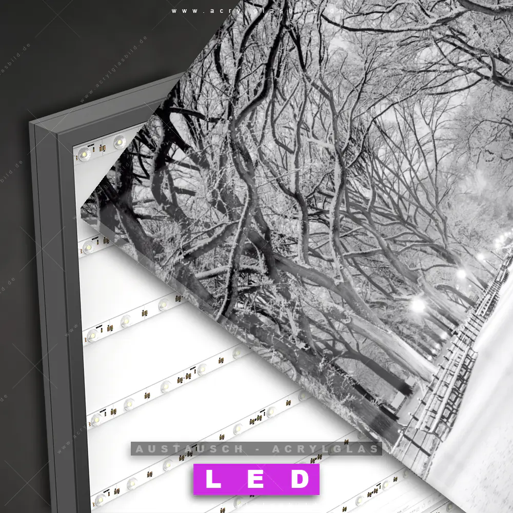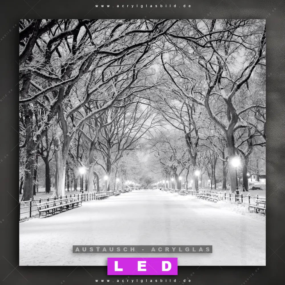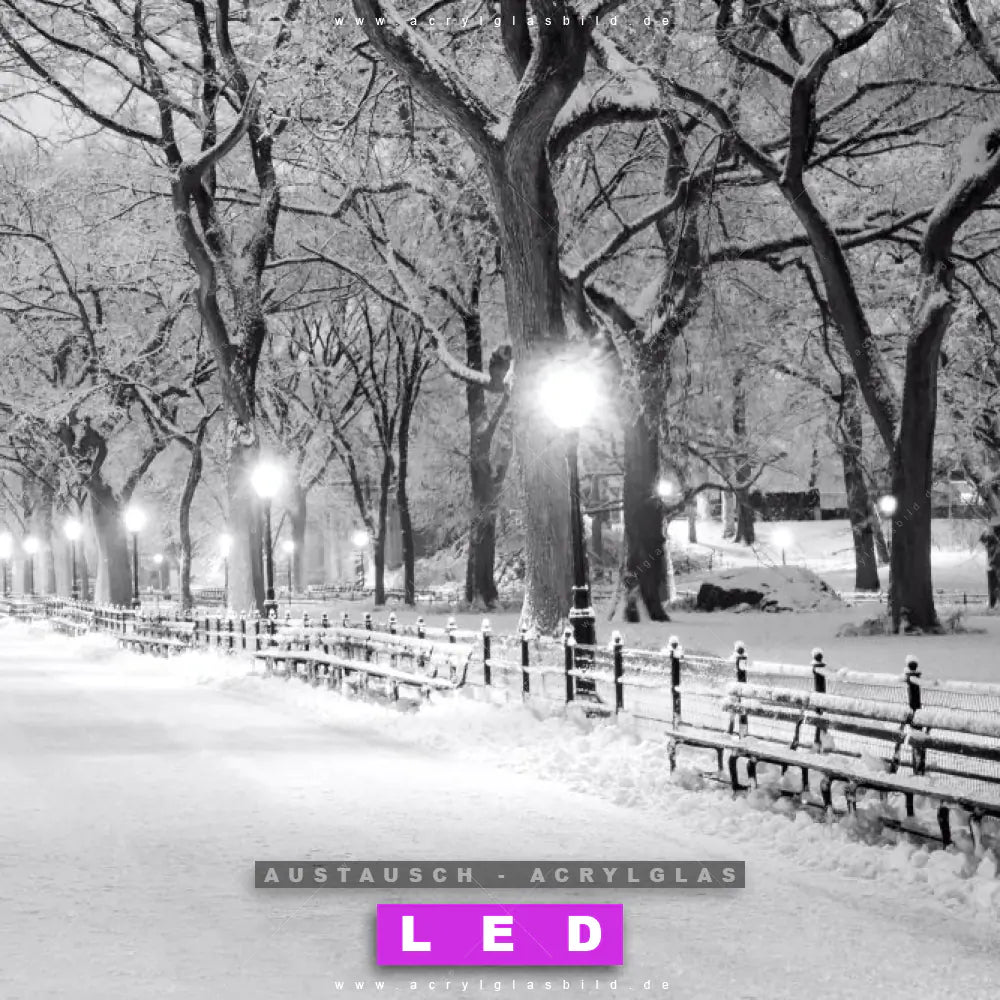 Begriffe wie Stadt, Skyline, Manhattan, New York, Amerika, Metropole, USA, Nacht, Abend, Reisen, Urlaub, Park, Weg, Laternen haben dich auf der Suche nach deinem neuen Austausch-Acrylglasbild inspiriert? Dann sollte das Wechsel-Acrylglasbild Verschneiter Parkweg für dein bereits vorhandenes LED Acrylglasbild Canvalight® DIA den Weg zu dir finden.