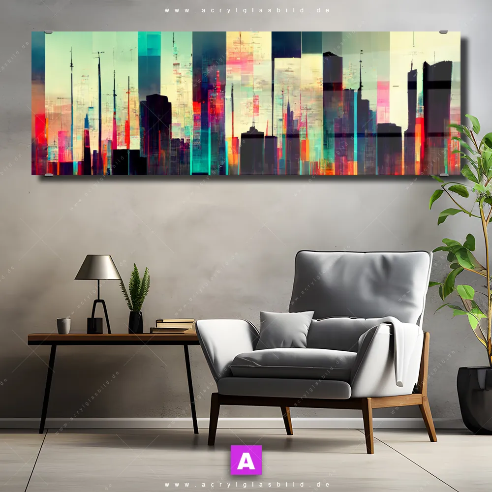 Fehlt dir die Inspiration beim Anblick deiner Wände, sodass selbst das Zählen der Wandfarbtropfen aufregender erscheint? Keine Sorge, wir haben das perfekte Kunstwerk für dich! Mit unserem Acrylglasbild Abstrakte Skyline No.3 im Panorama-Format verleihst du deinem Raum den dringend benötigten Wow-Faktor. Lass deine Wände mit unserem Bunte Skyline-Malerei Acrylglasbild zum Star werden!