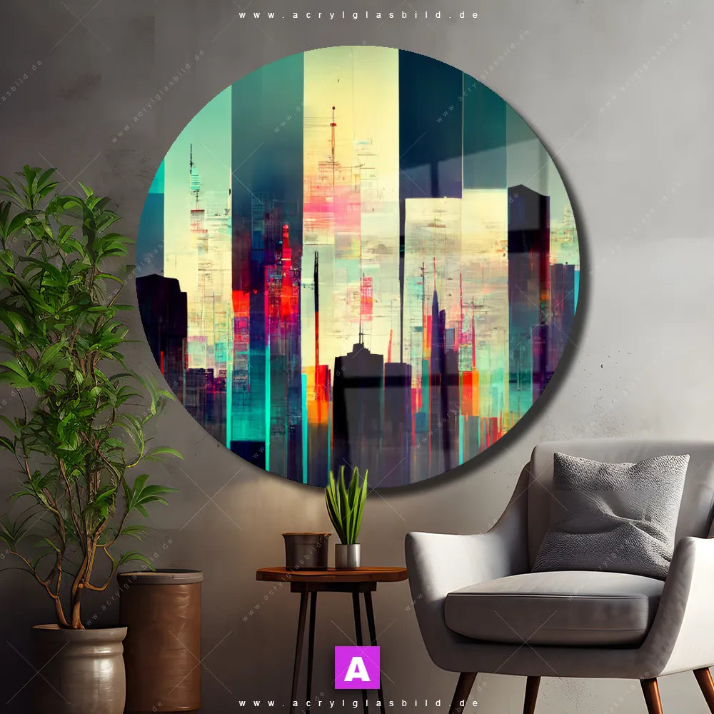 Hey du! Bist du es auch leid, auf langweilige, weiße Wände in deinem Raum zu starren und dich zu fragen, ob das der Sinn des Lebens ist? Unser Acrylglasbild mit dem Titel Abstrakte Skyline No.3 im Format Rund verwandelt deine Wand in ein Kunstwerk und macht deinen Raum zum absoluten Hingucker.