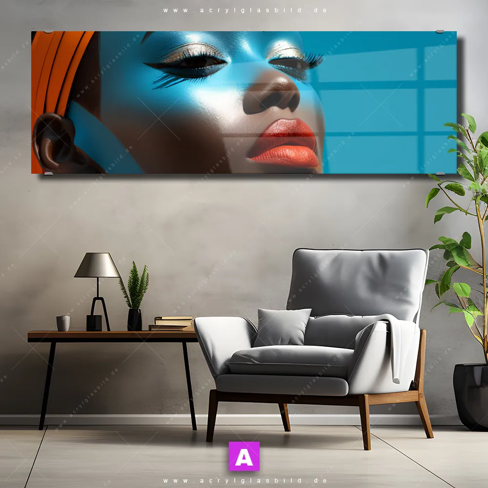 Das Motiv Afrikanische Frau mit Turban wird im UV-Direktdruck in den Farben Blau, Braun, Rot, Orange auf die Rückseite einer 5mm starken, transparenten Acrylglasplatte gedruckt. Das durchscheinende Motiv Gesichtsbemahlung einer Frau im Modern Art Stil wird anschließend vollflächig mit einer weißen Schicht hinterlegt. Das Porträts - Menschen Acrylglasbild | Panorama erhält so eine bemerkenswerte Farbbrillanz, hohe Schärfe und erstaunliche Tiefenwirkung.