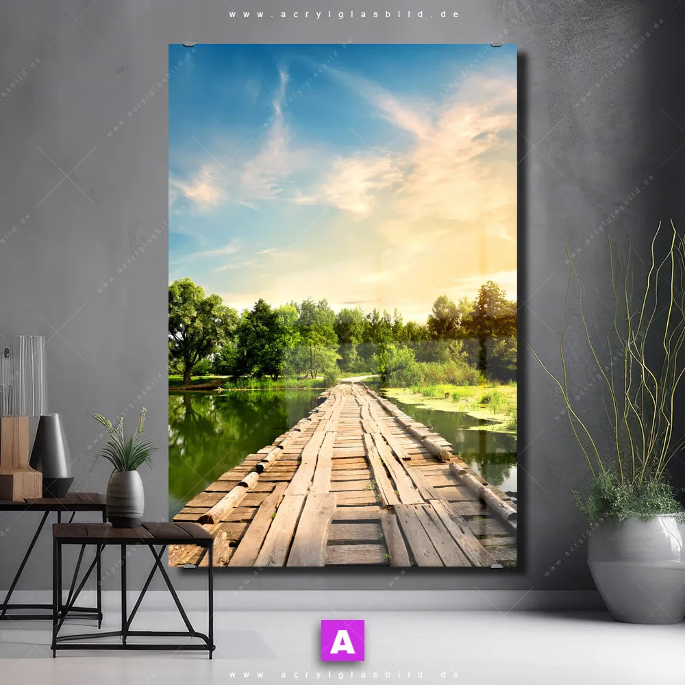 Also, worauf wartest du noch? Verwandle deine schlichten Wände in inspirierende Kunstwerke und bestelle jetzt das Acrylglasbild Holzbrücke über fließendem Gewässer!