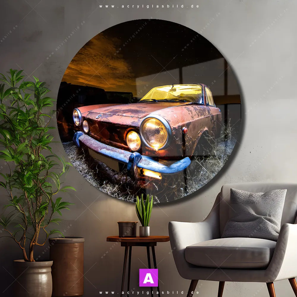 Hey du! Bist du es auch leid, auf langweilige, weiße Wände in deinem Raum zu starren und dich zu fragen, ob das der Sinn des Lebens ist? Unser Acrylglasbild mit dem Titel Altes Auto im Format Rund verwandelt deine Wand in ein Kunstwerk und macht deinen Raum zum absoluten Hingucker.