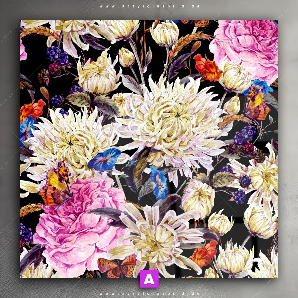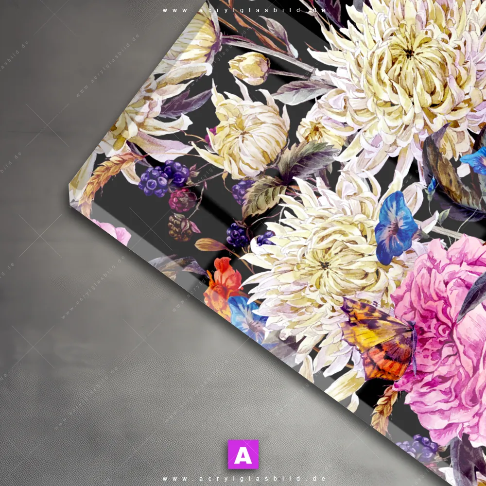 Das Motiv Aquarell von wilden Blumen wird im UV-Direktdruck in den Farben Weiss, Schwarz, Blau, Lila, Orange, Rot, Rosa auf die Rückseite einer 5mm starken, transparenten Acrylglasplatte gedruckt. Das durchscheinende Motiv Blütenvielfalt im Floral, Retro - Vintage Stil wird anschließend vollflächig mit einer weißen Schicht hinterlegt. Das Blumen - Botanik Acrylglasbild | Quadrat erhält so eine bemerkenswerte Farbbrillanz, hohe Schärfe und erstaunliche Tiefenwirkung.