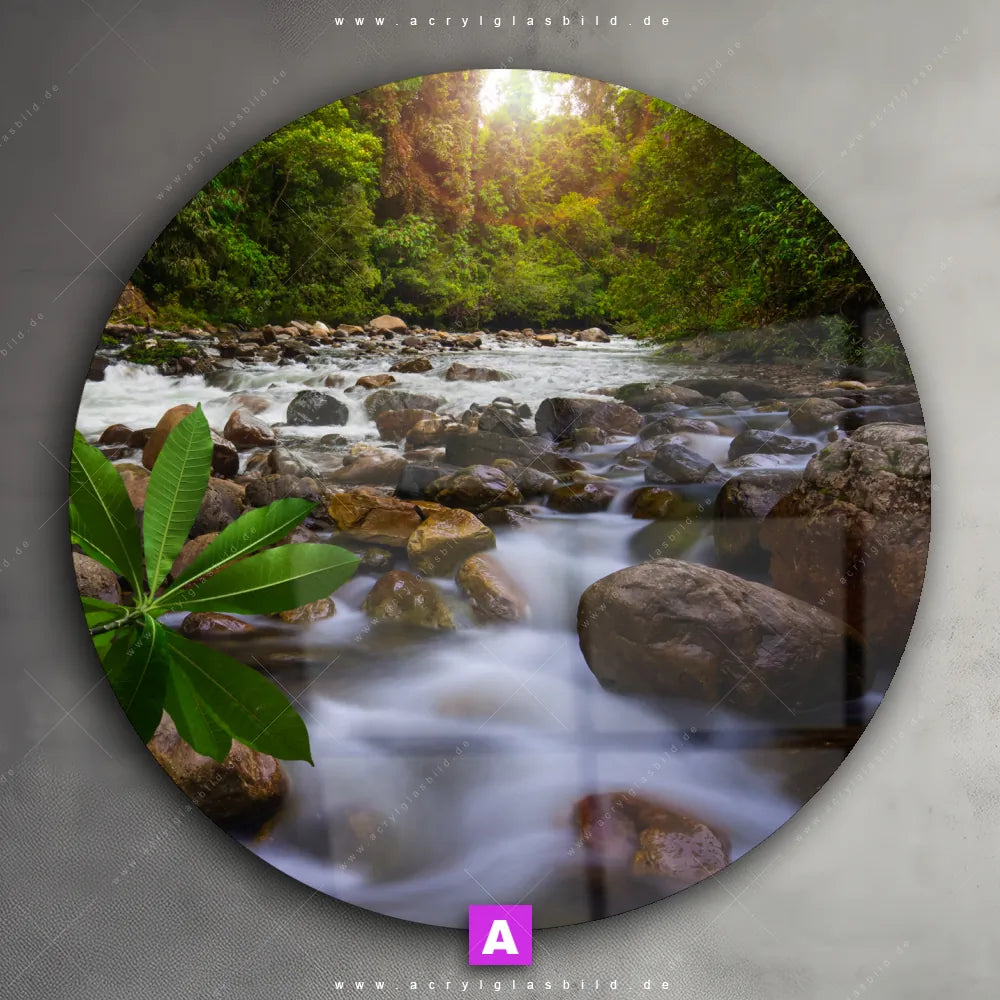 Das Motiv Asiatischer tropischer Dschungel wird im UV-Direktdruck in den Farben Grün, Braun auf die Rückseite einer 5mm starken, transparenten Acrylglasplatte gedruckt. Das durchscheinende Motiv Tropenwald mit steinigem Bach im Natürlich - Realistisch Stil wird anschließend vollflächig mit einer weißen Schicht hinterlegt. Das Landschaften, Wald - Bäume Acrylglasbild | Rund erhält so eine bemerkenswerte Farbbrillanz, hohe Schärfe und erstaunliche Tiefenwirkung.
